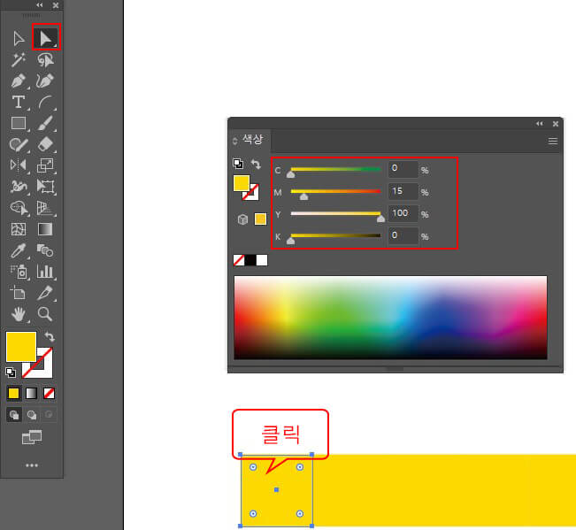 (C:0,M:15,Y:100,K:0)으로 수정합니다.