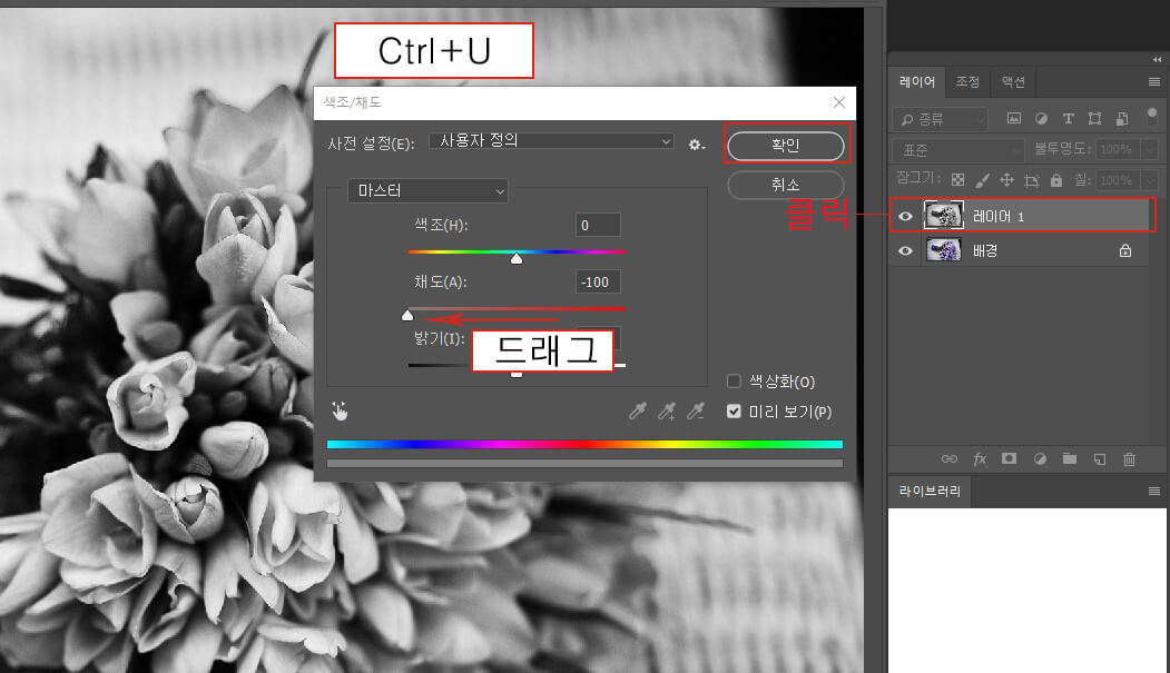 Ctrl+U를 눌러 [색조/채도] 창이 나오면