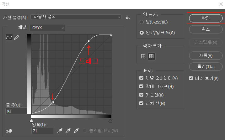 을 눌러 커브 창이 열리면 S자 보정을 합니다.