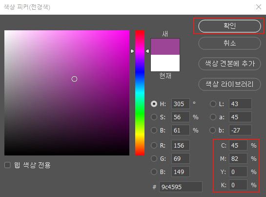 'C:45, M:82, Y:0, K:0'으로 설정합니다.