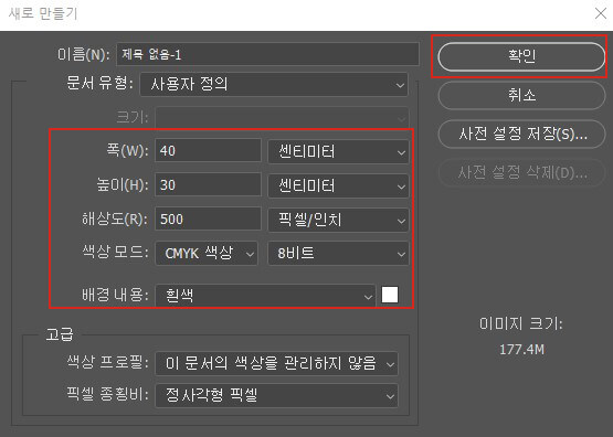 클릭합니다. 폭-40cm, 높이-30cm, 해상도-500
