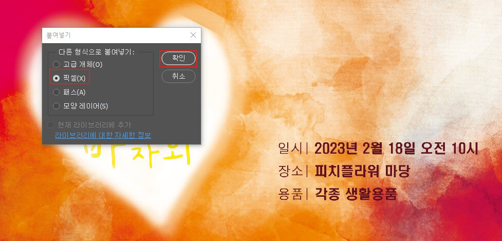 붙여넣기 창이 뜨면 픽셀을 선택하고