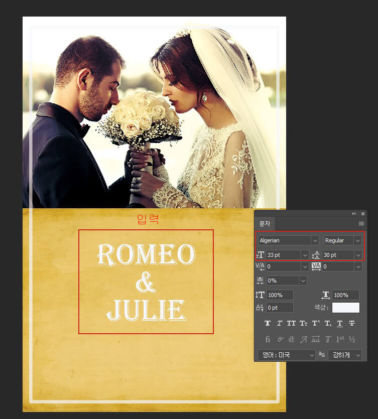 문자 패널에서 글꼴을 'Algerian, 크기를 33pt