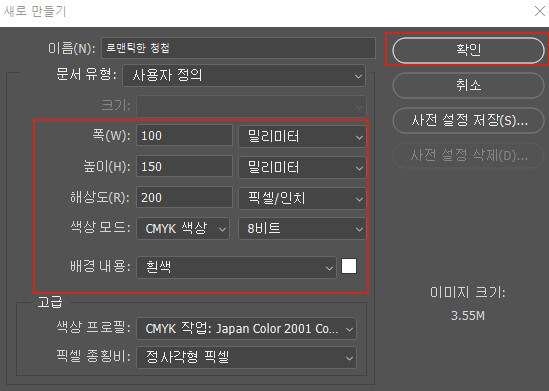CMYK 모드 배경 내용은 흰색으로 설정하고