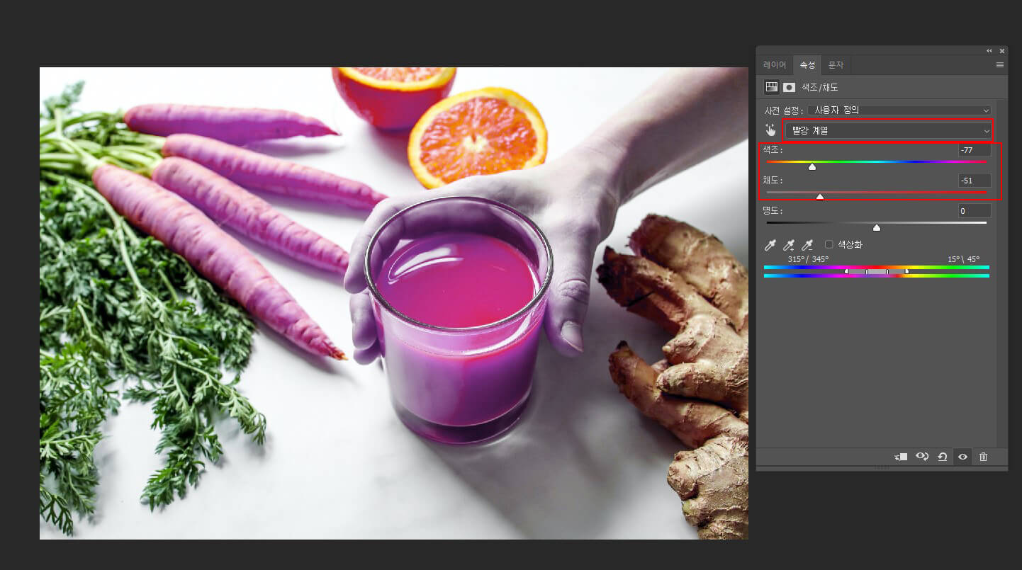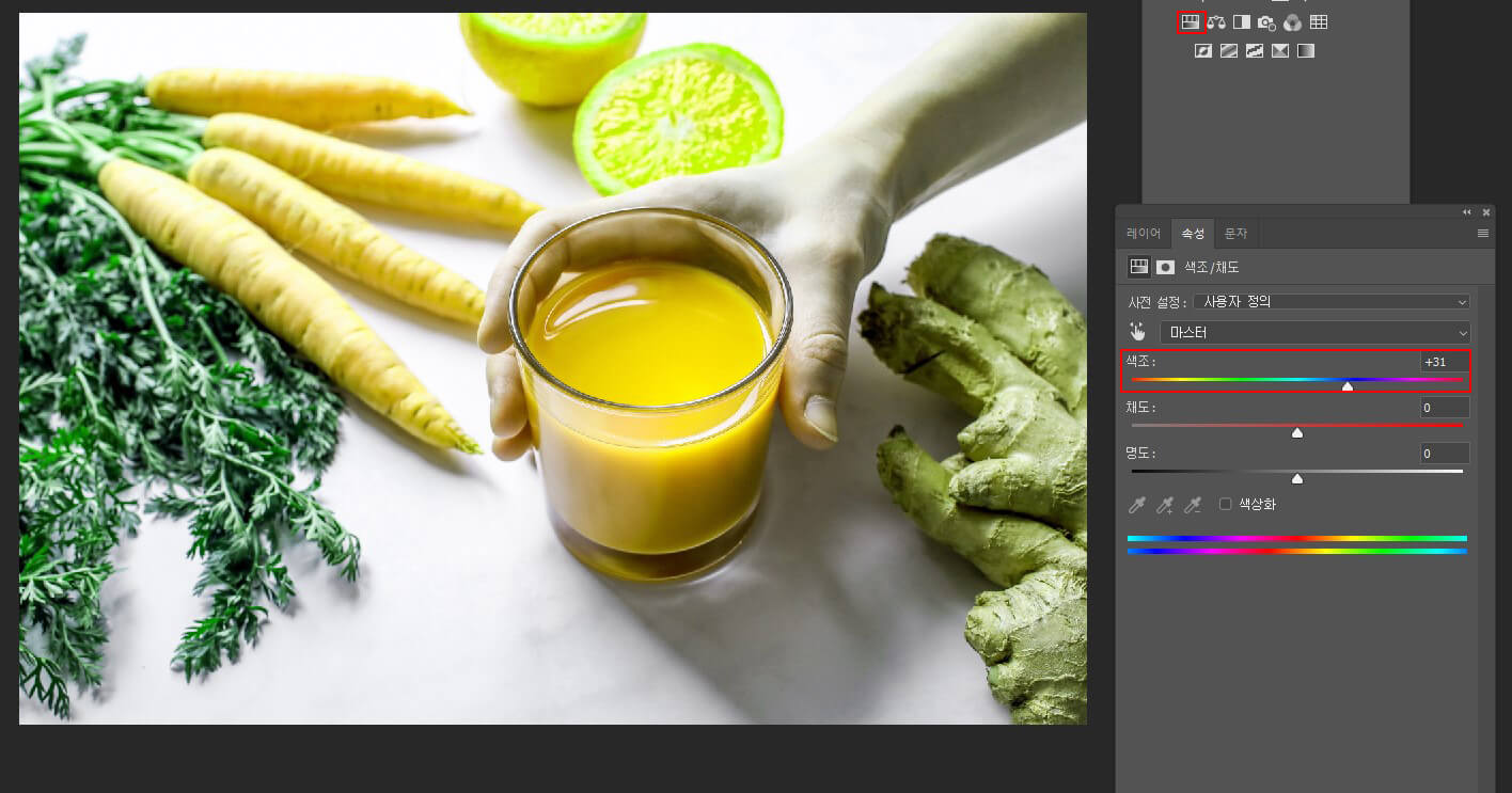 [속성] 패널에서 Hue 슬라이더를 오른쪽으로