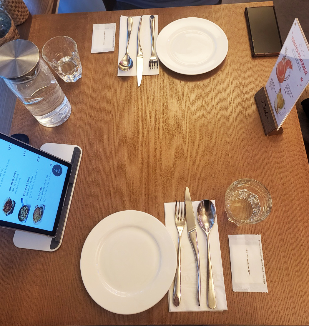 접시와 식기류, 냅킨, 물티슈, 컵이