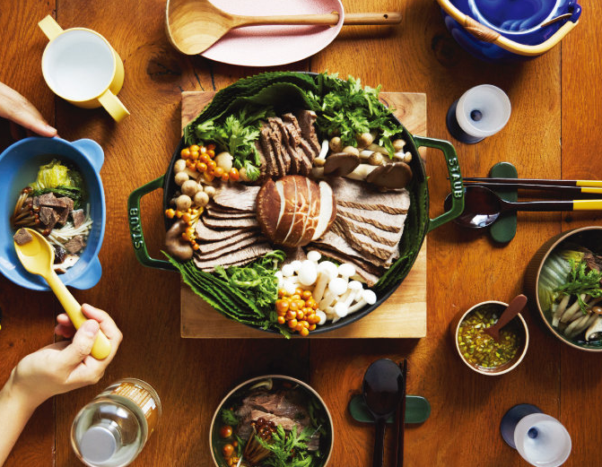 7 전골냄비에 쑥갓을 깔고 고기를 얹는다.