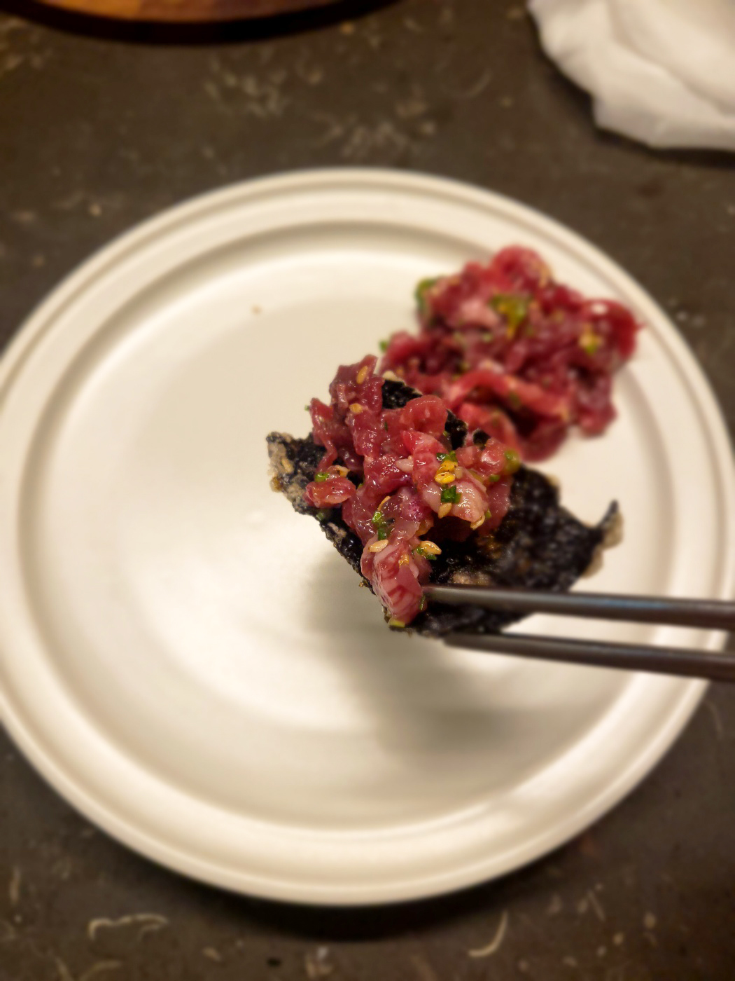 김부각 위에 육회를 살짝