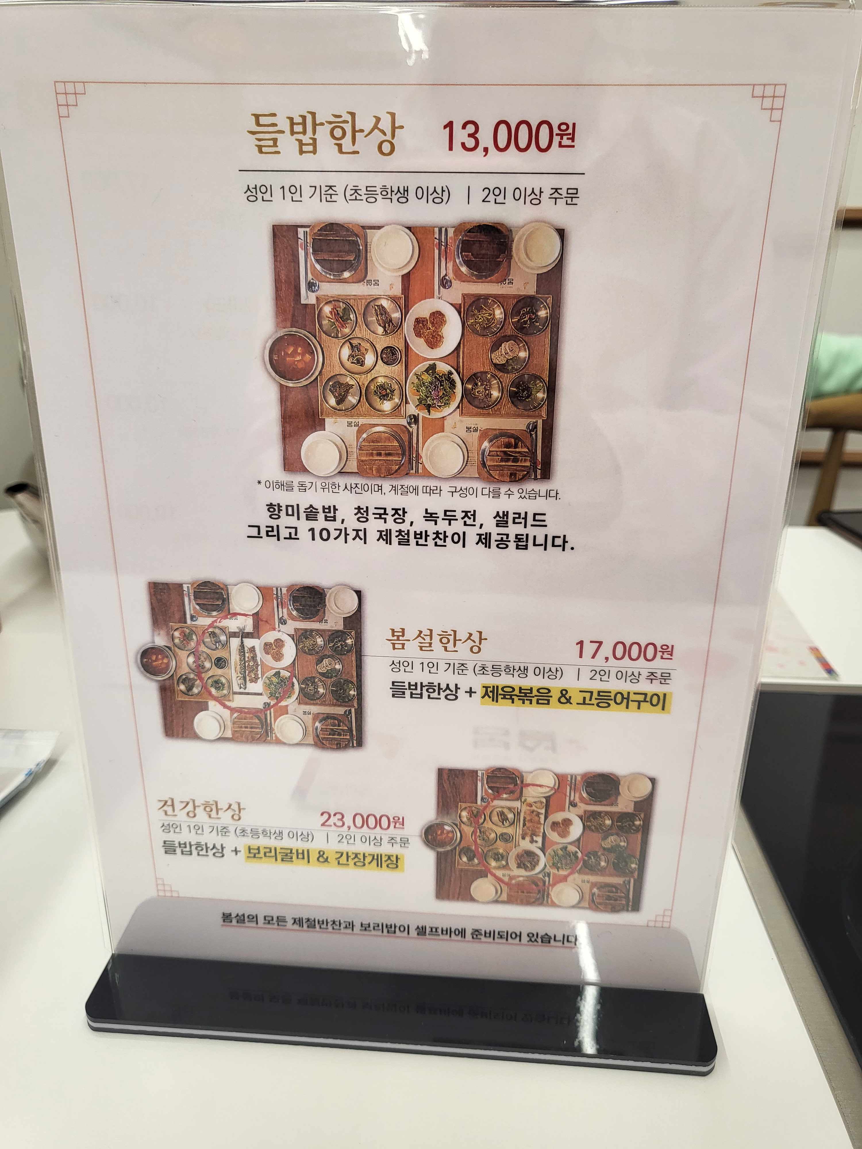 메뉴는 들밥한상, 봄설한상, 건강한상