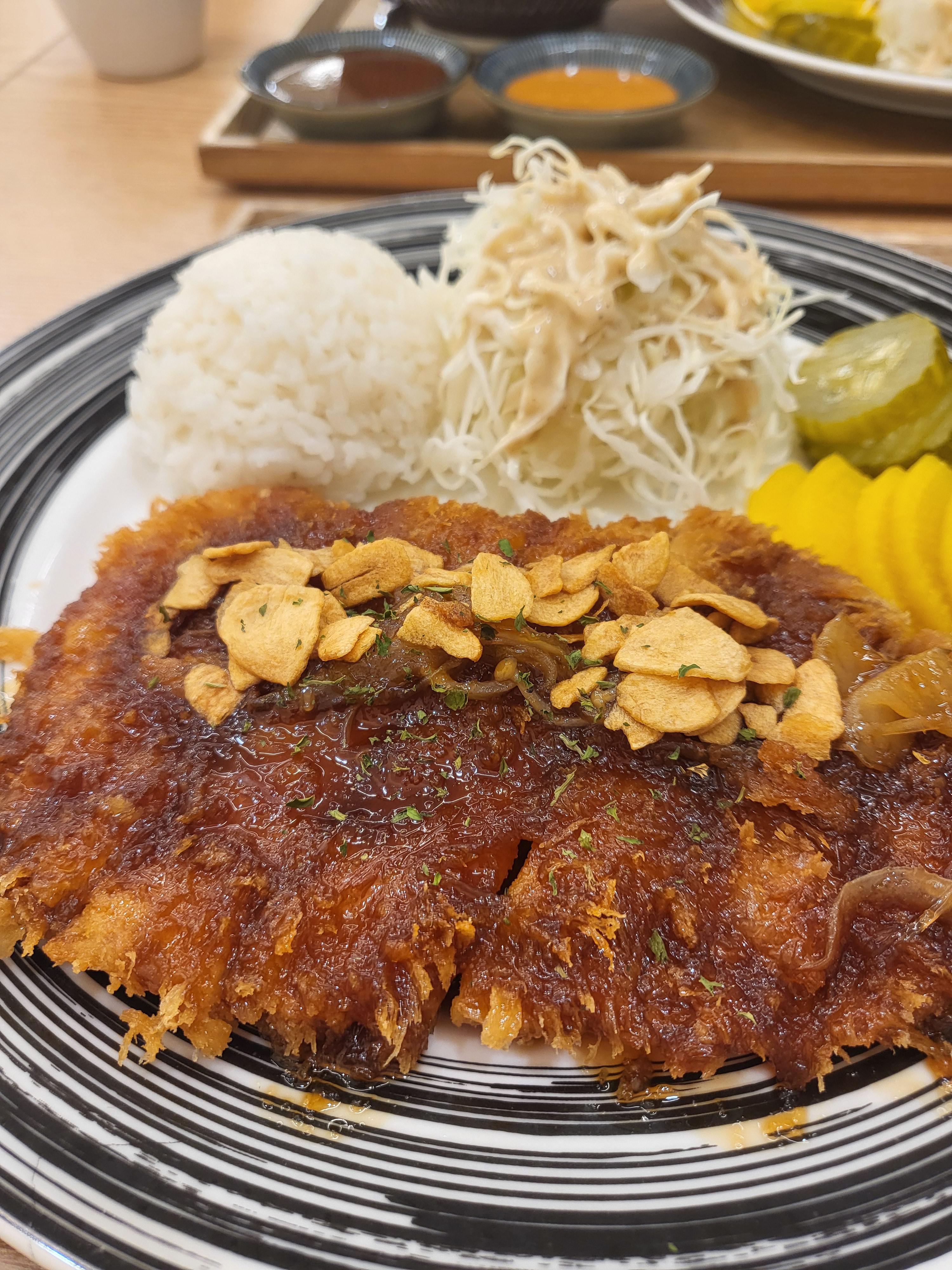 마늘 후레이크가 돈가스의 고소한 맛을 더해주어 일품이었습니다.