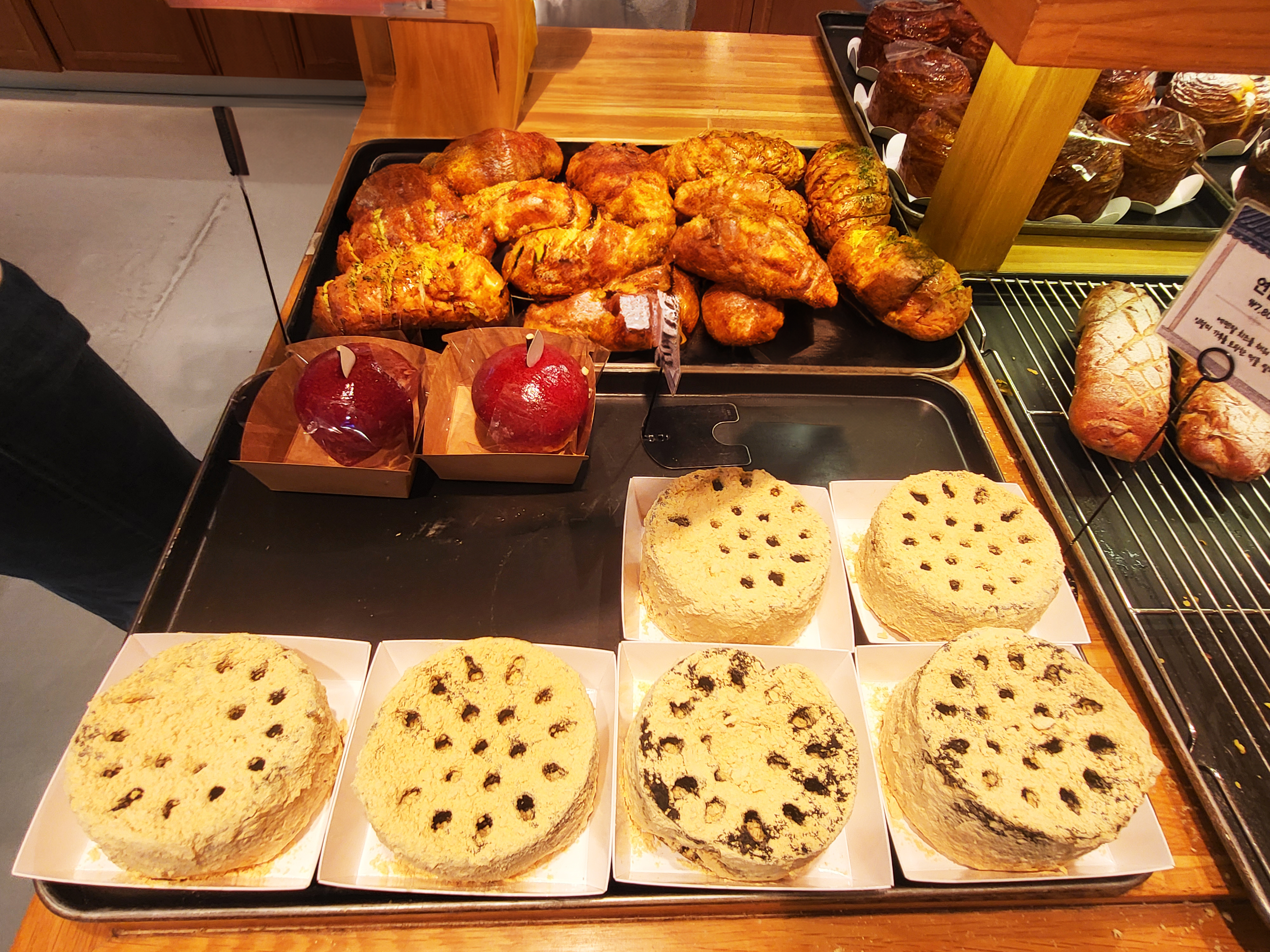 혜경궁베이커리에서는 다양한 종류의 베이커리가 준비되어 있었어요. 처음 봤을 때 눈에 확 들어온 것은 연탄 모양의 빵이었어요! 비주얼이 너무 재미있어서 고르지 않을 수 없었죠. 그리고 케이크들은 알록달록한 색감이 돋보였답니다.