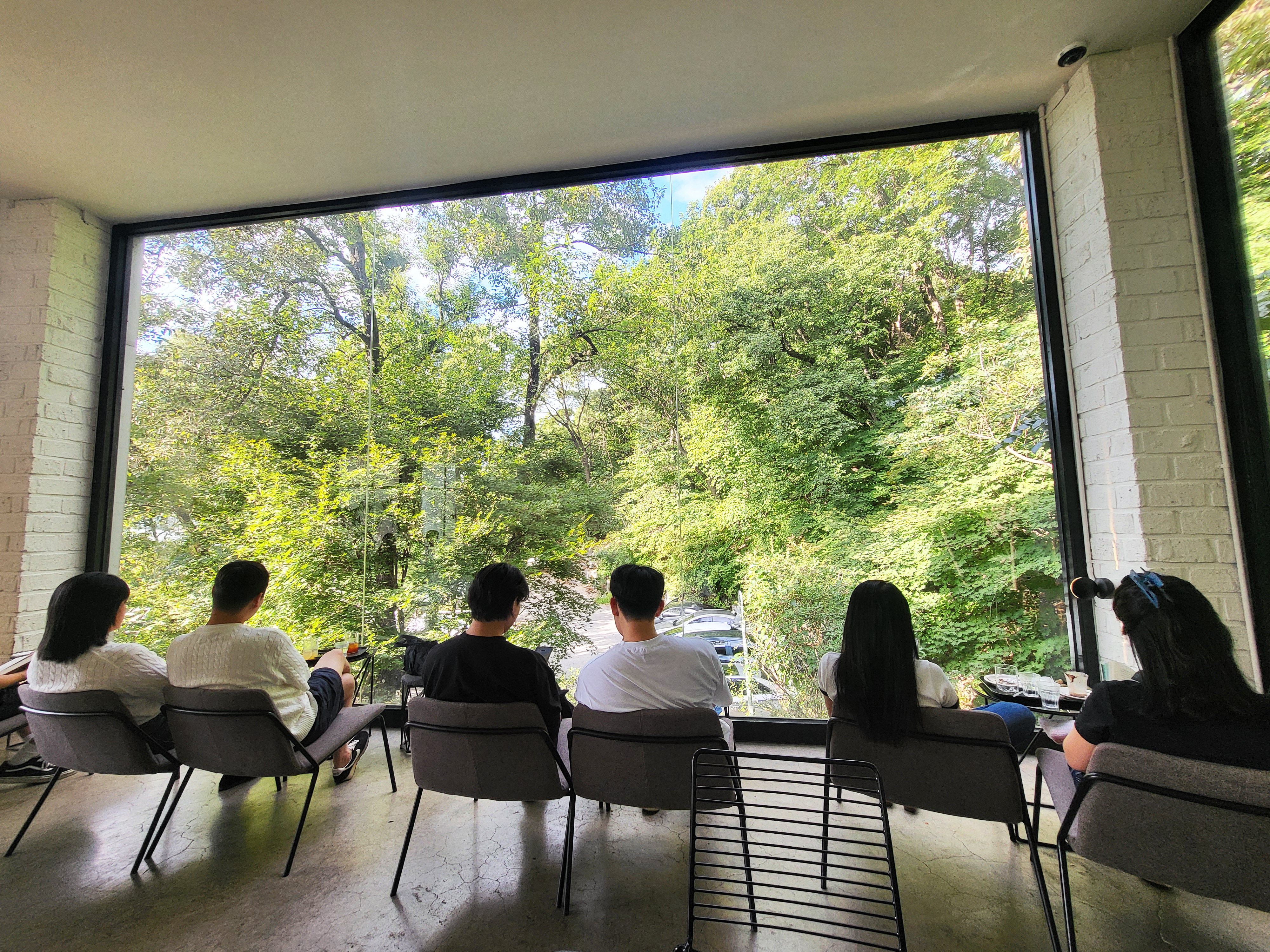 2층에서는 넓은 통창을 통해 푸른 숲뷰를 한눈에 담을 수 있어서 정말 좋았답니다. 만석인 이유를 알겠더라구요! 🍃