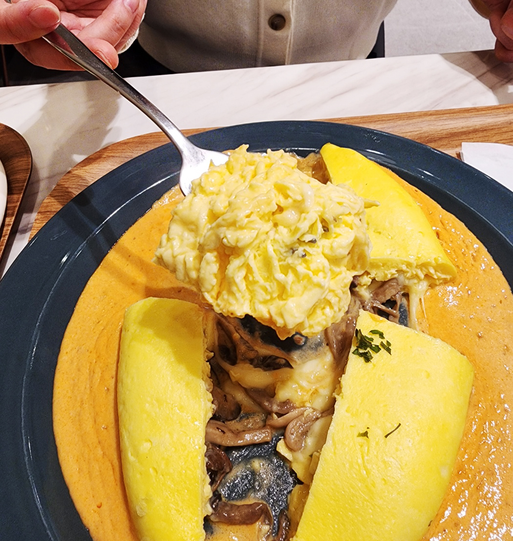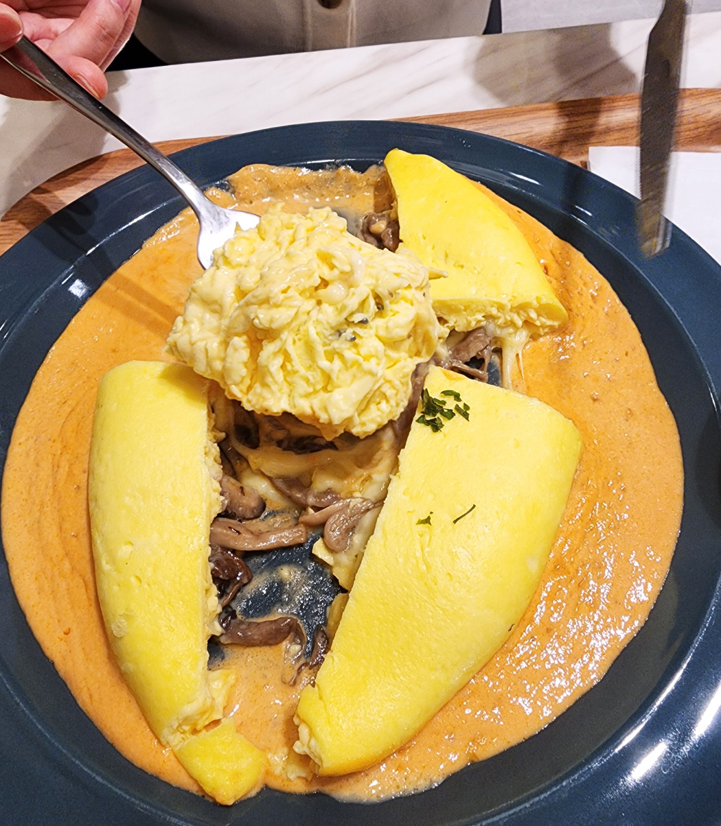 - 로제오믈렛은 4가지 버섯과 시금치, 모짜렐라 치즈가 어우러져 깊고 부드러운 맛이 인상적이었어요.