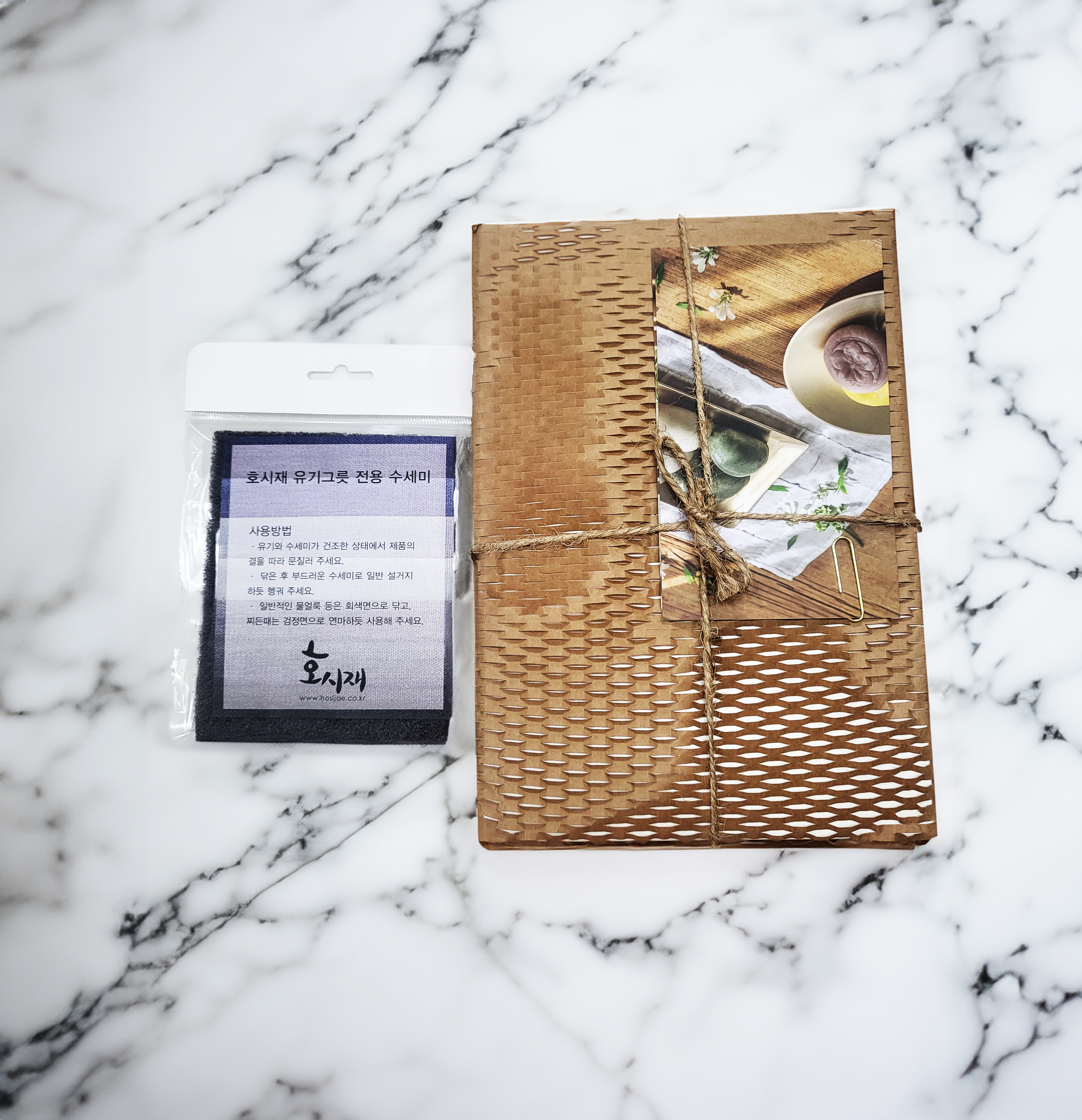 품질 보증서와 함께 전용 수세미까지 포함되어 있었어요.