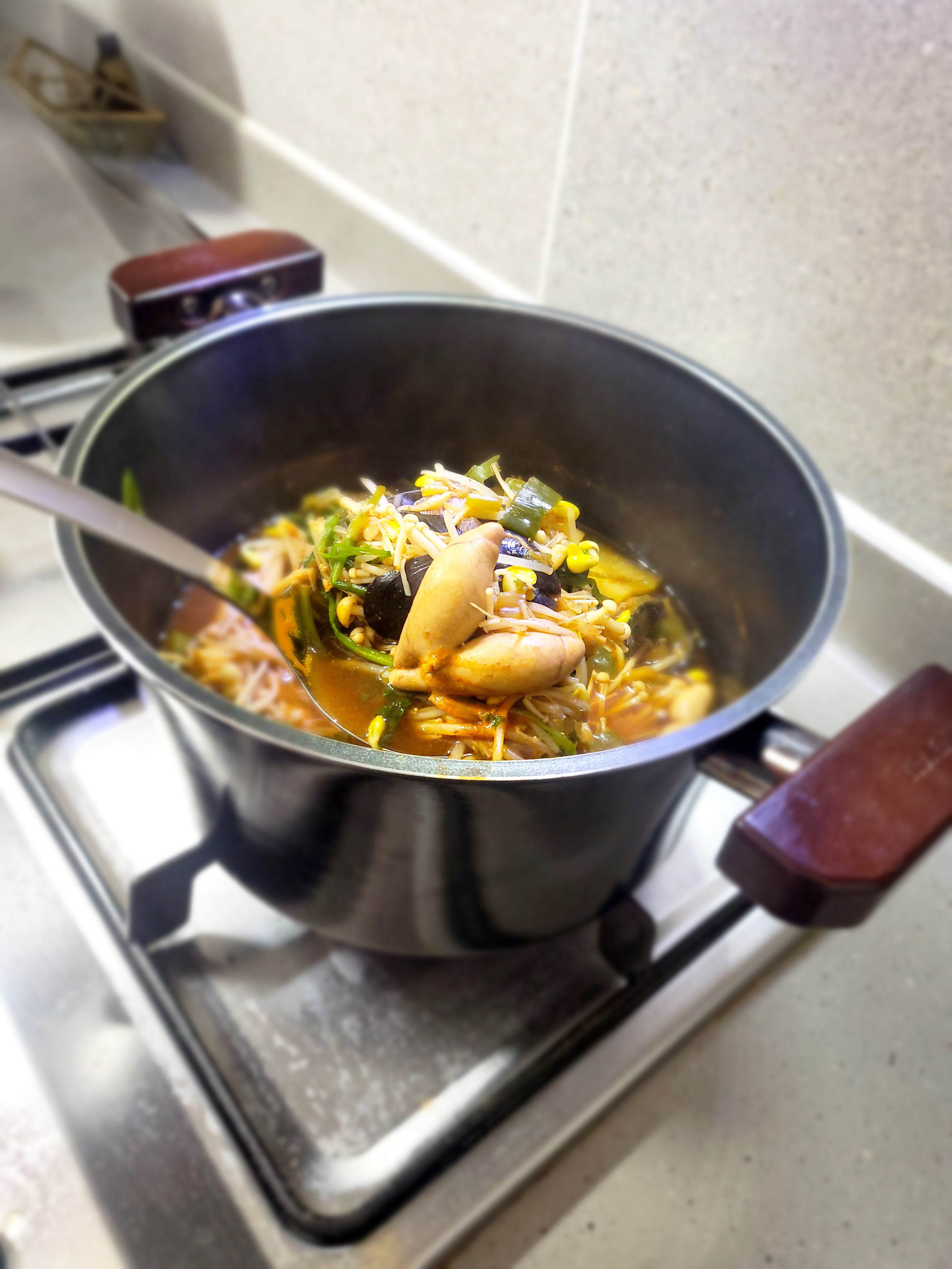 콩나물, 팽이버섯, 미나리를 넣고 또 6분 정도 더 끓이면 끝!