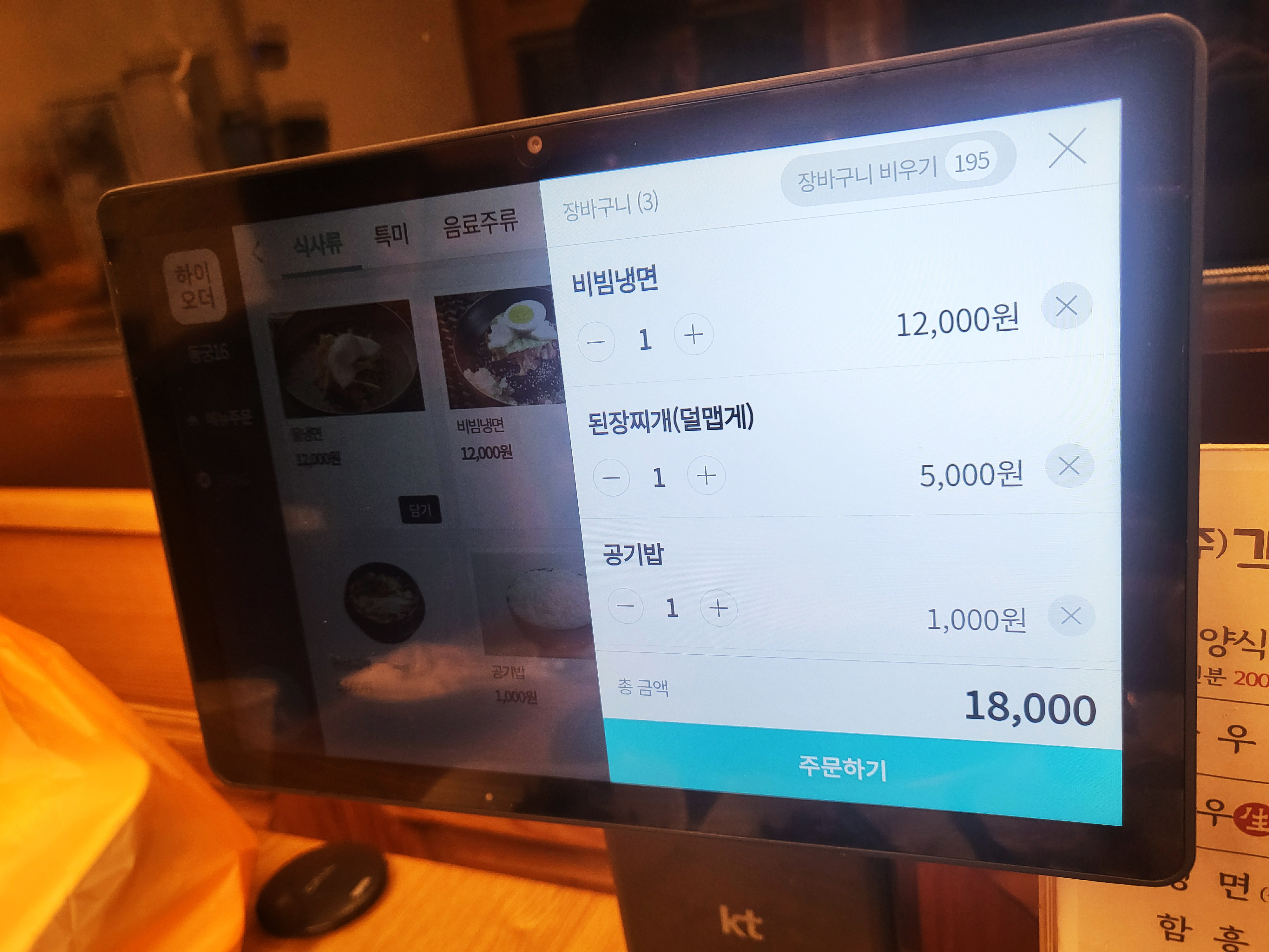 추가로 주문한 비빔냉면과 된장찌개도 훌륭했어요.