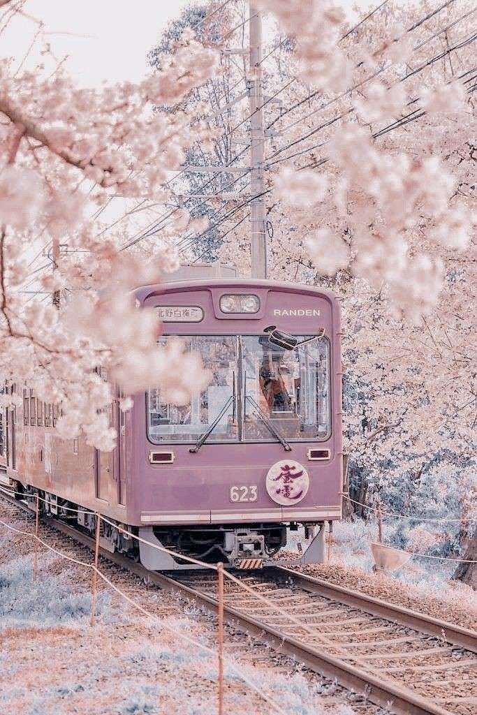 먼저, 첫 번째 사진은 벚꽃이 활짝 핀 길 위를 달리는 기차예요. 사진으로 찍었을 때는 그냥 예쁜 봄날의 풍경 정도였는데,