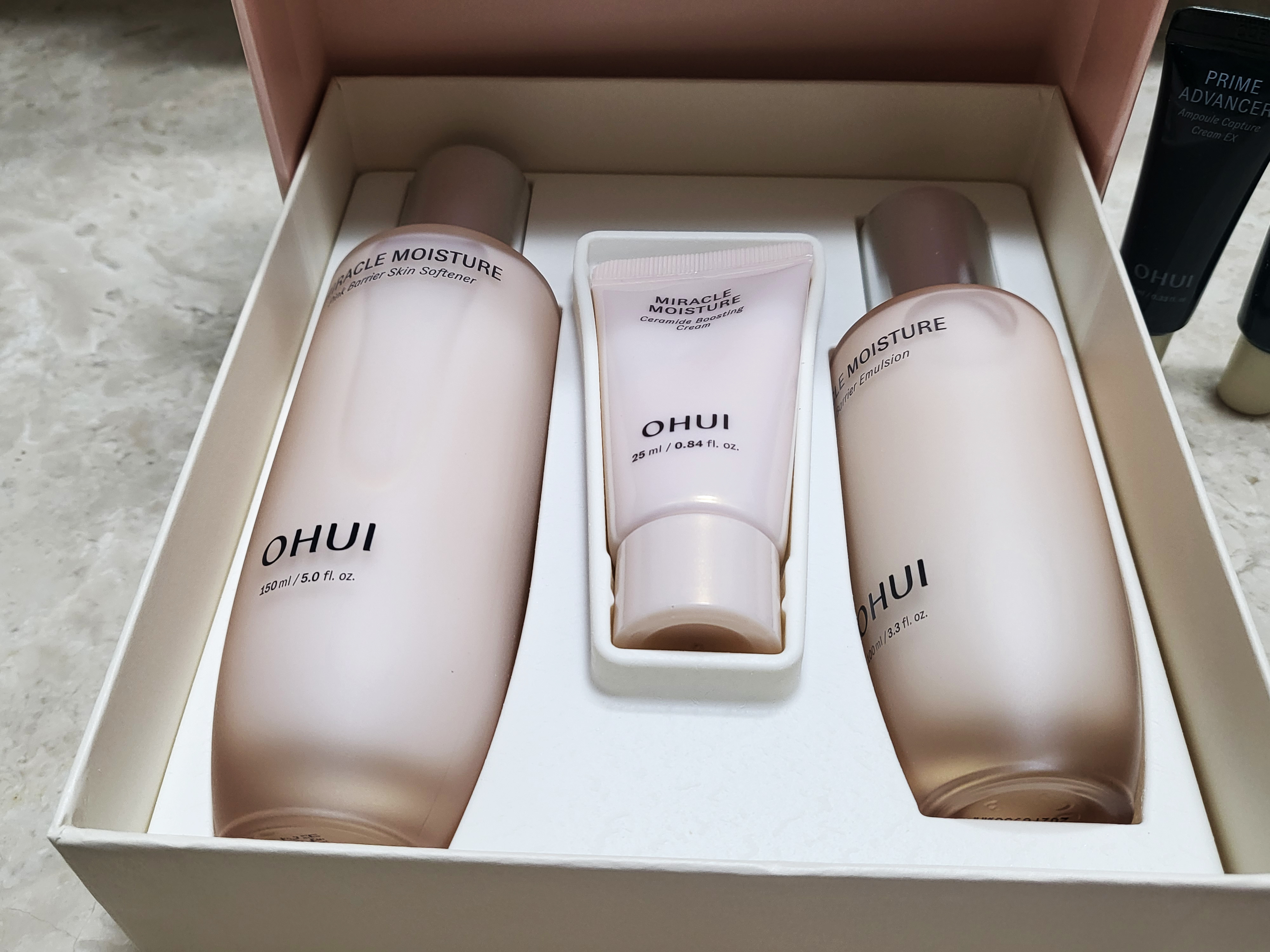오휘기초세트는 미라클 모이스처 핑크 베리어 2종 기획세트로 구성되어 있었어요. 핑크베리어 스킨 소프터(150ml)와 에멀전(100ml), 그리고 세라마이드 부스팅 크림(25ml)까지, 정말 알차게 들어있더라고요. 증정받은 세럼까지 있어서 더욱 만족스러웠어요.