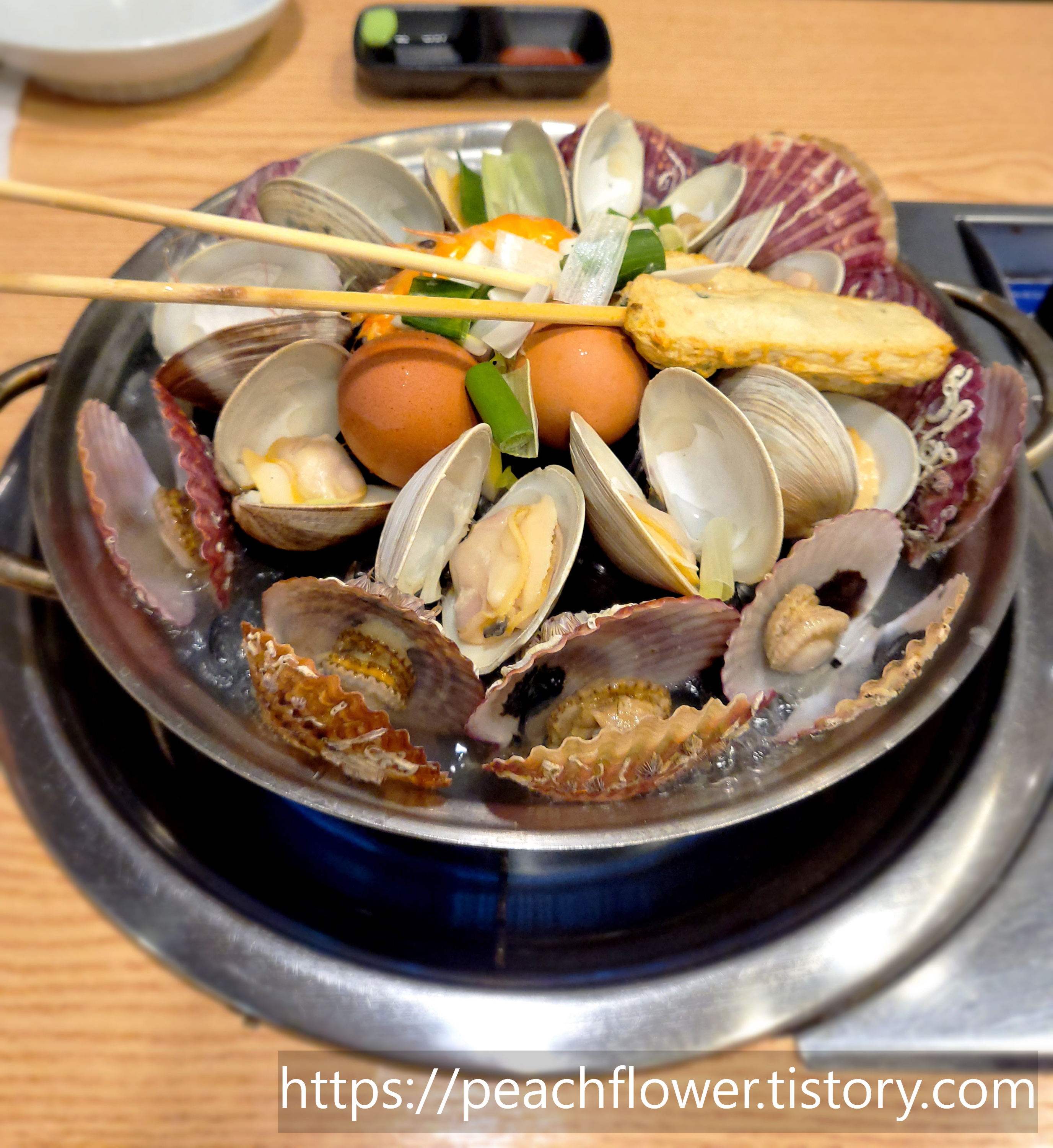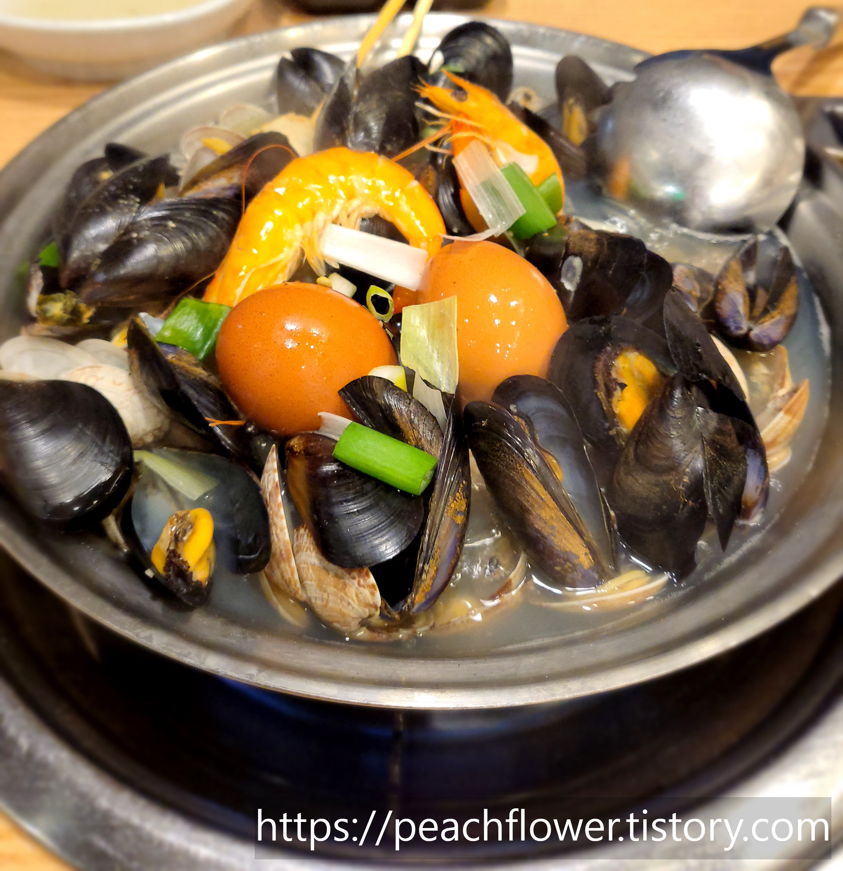 먼저 조개전골이 나왔는데, 해산물이 너무나 푸짐하고 국물 맛도 정말 진하고 시원했어요🐚 어묵과 계란도 들어있어서 먹는 재미가 더해졌고, 어묵은 양념장에 찍어 먹으니 고소함이 배가 됐답니다! 국물 한 입에 바다의 맛이 입안 가득 퍼지며 정말 속이 편안해졌어요.