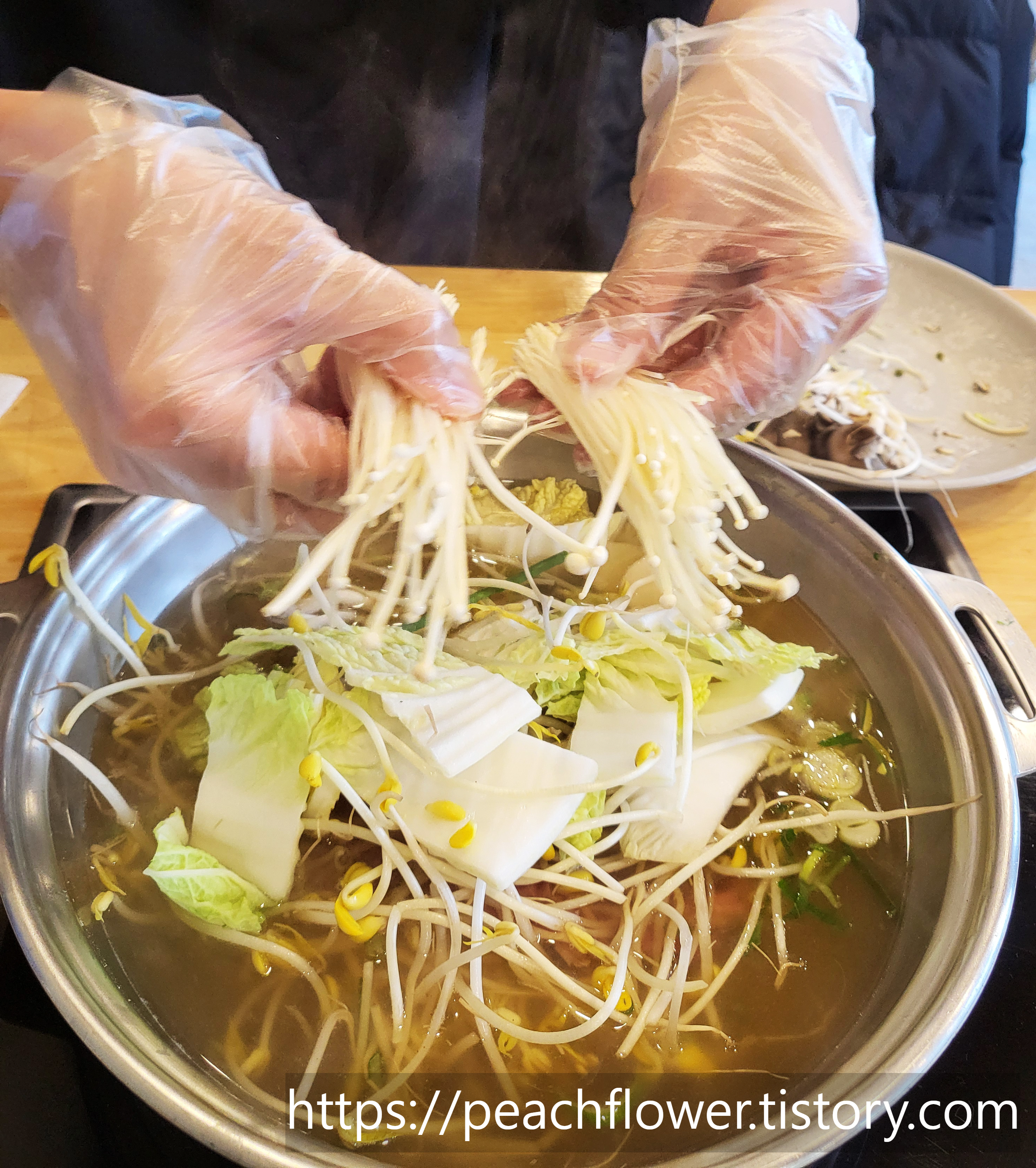 이곳의 야채육수는 정말 깊고 진한 맛이었어요. 고기, 만두, 야채가 함께 어우러져 풍성한 맛을 느낄 수 있었답니다. 또한, 버섯을 위생장갑을 끼고 찢어 넣는 모습이 조금 특별했어요. 🧤