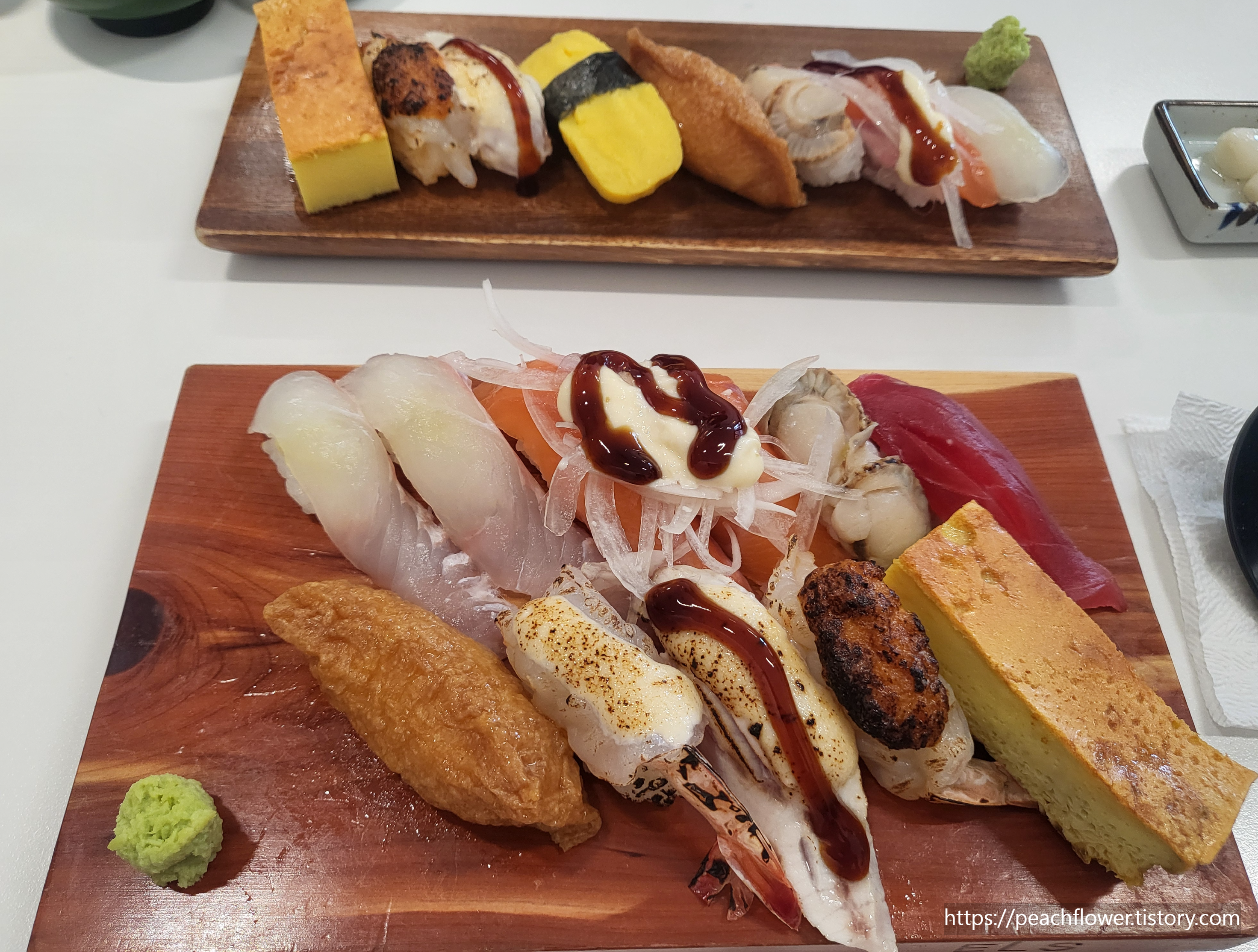 구운 황새치초밥과 갈릭새우초밥은 바삭하게 구운 식감과 마늘의 고소함이 어우러져 아주 훌륭했어요. 숯불 향이 배어 있어 더욱 풍미가 깊었답니다.