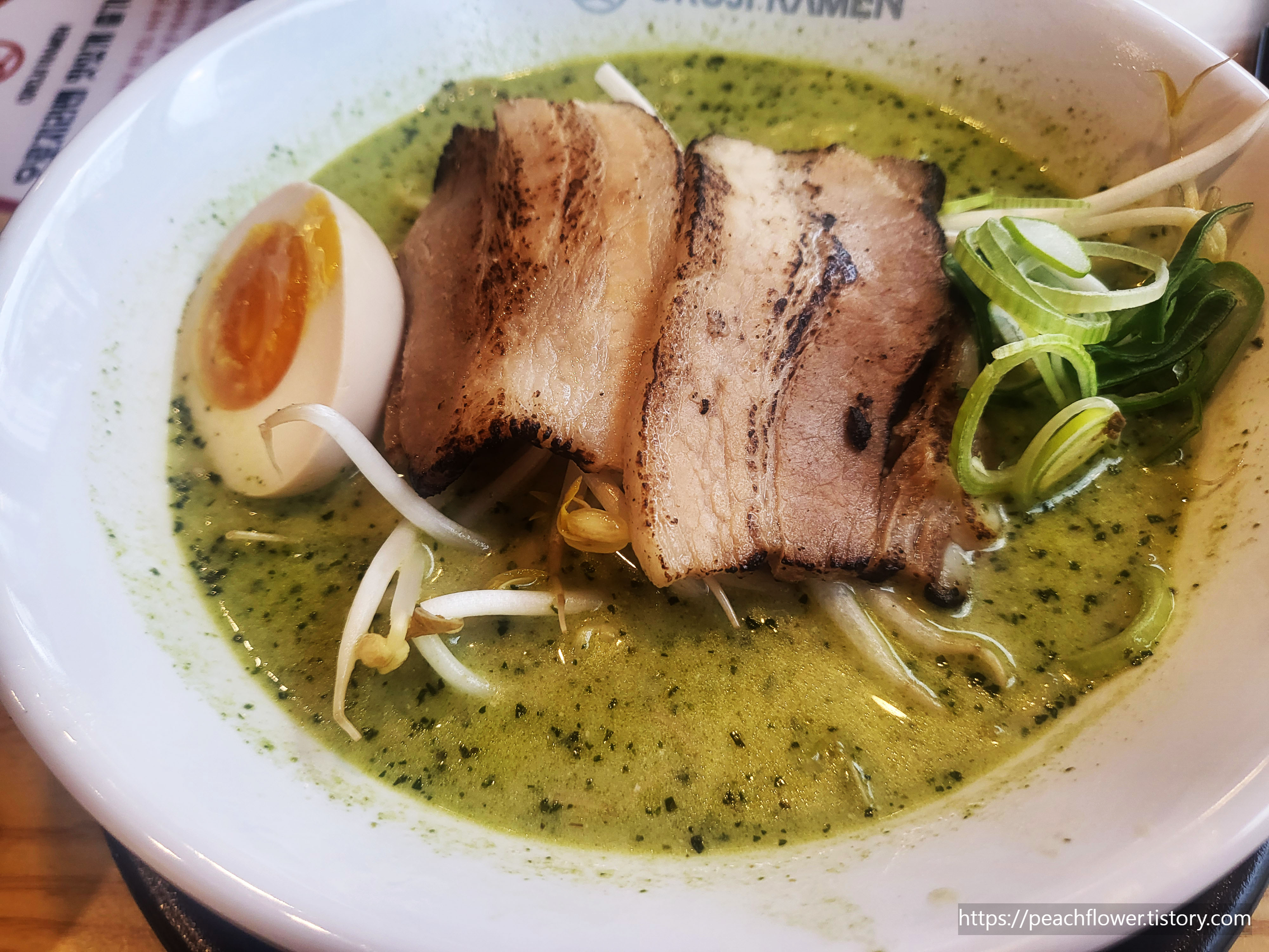 바질라멘은 고소한 바질 국물과 두툼한 차슈,