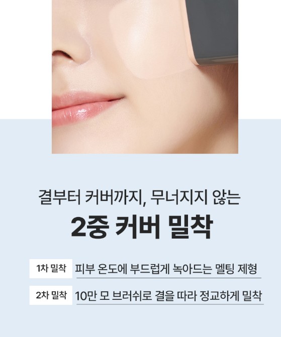 코팅 피그먼트가 균일하게 분산돼서 뭉침 없이 얇게 발리고, 하루 종일 들뜸 없이 피부에 착 달라붙어요.