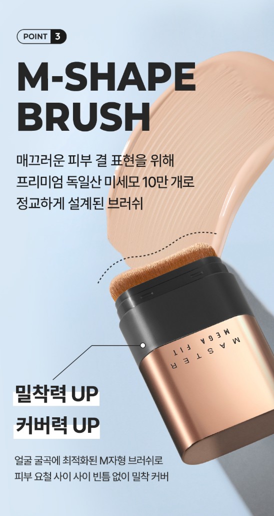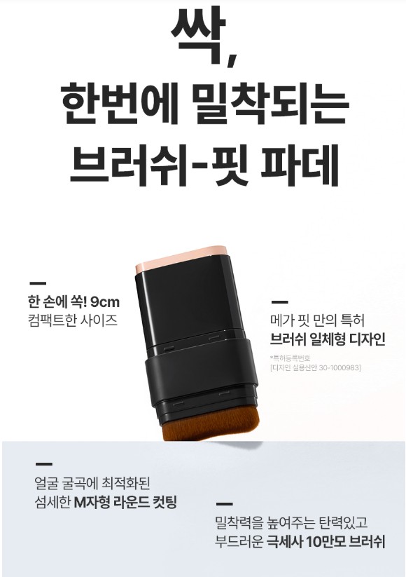 특허 받은 브러쉬 일체형 디자인이라 브러쉬를 따로 챙길 필요 없고, M자형 라운드 컷팅 덕분에 얼굴 굴곡까지 세밀하게 커버할 수 있습니다.