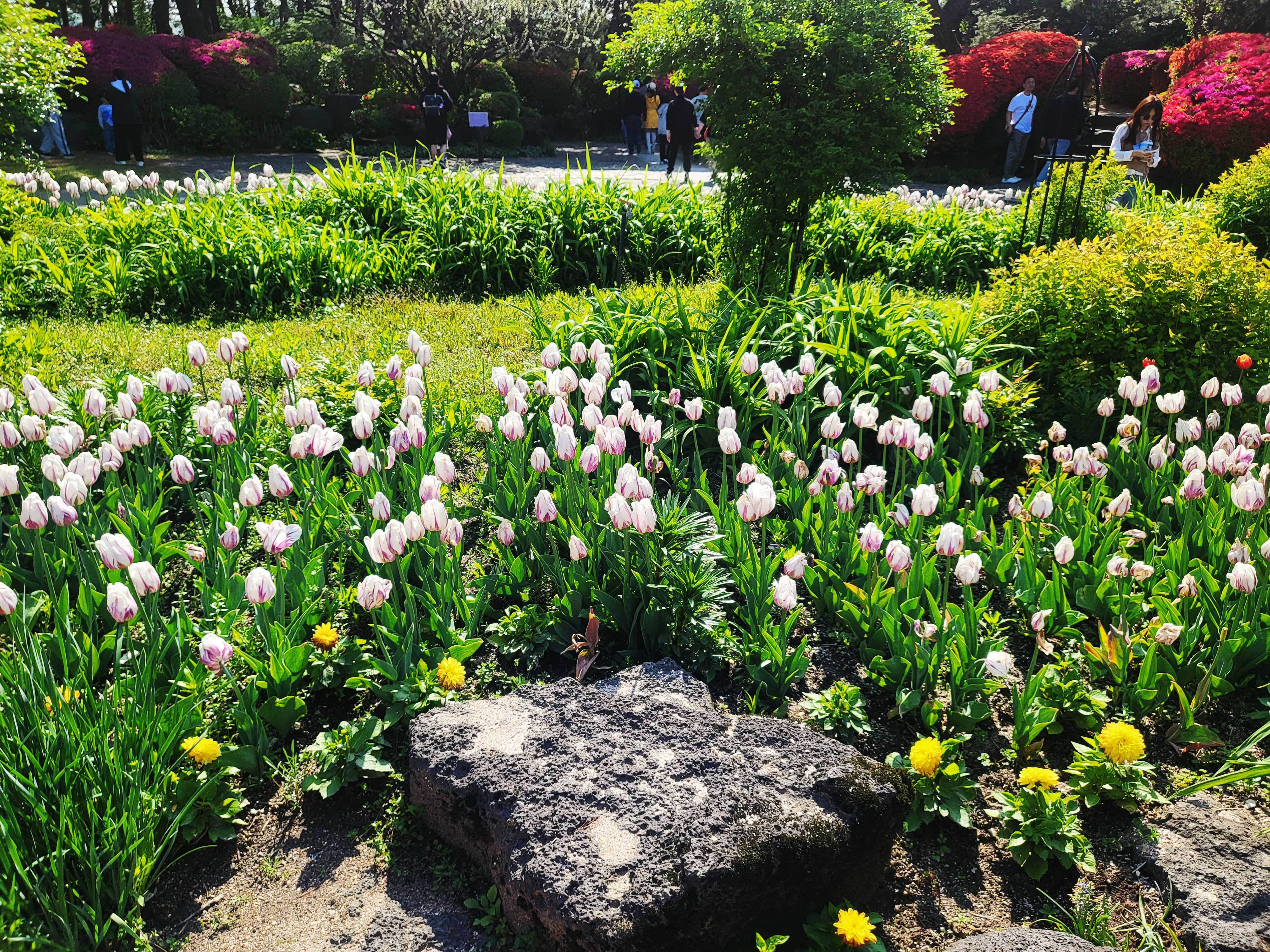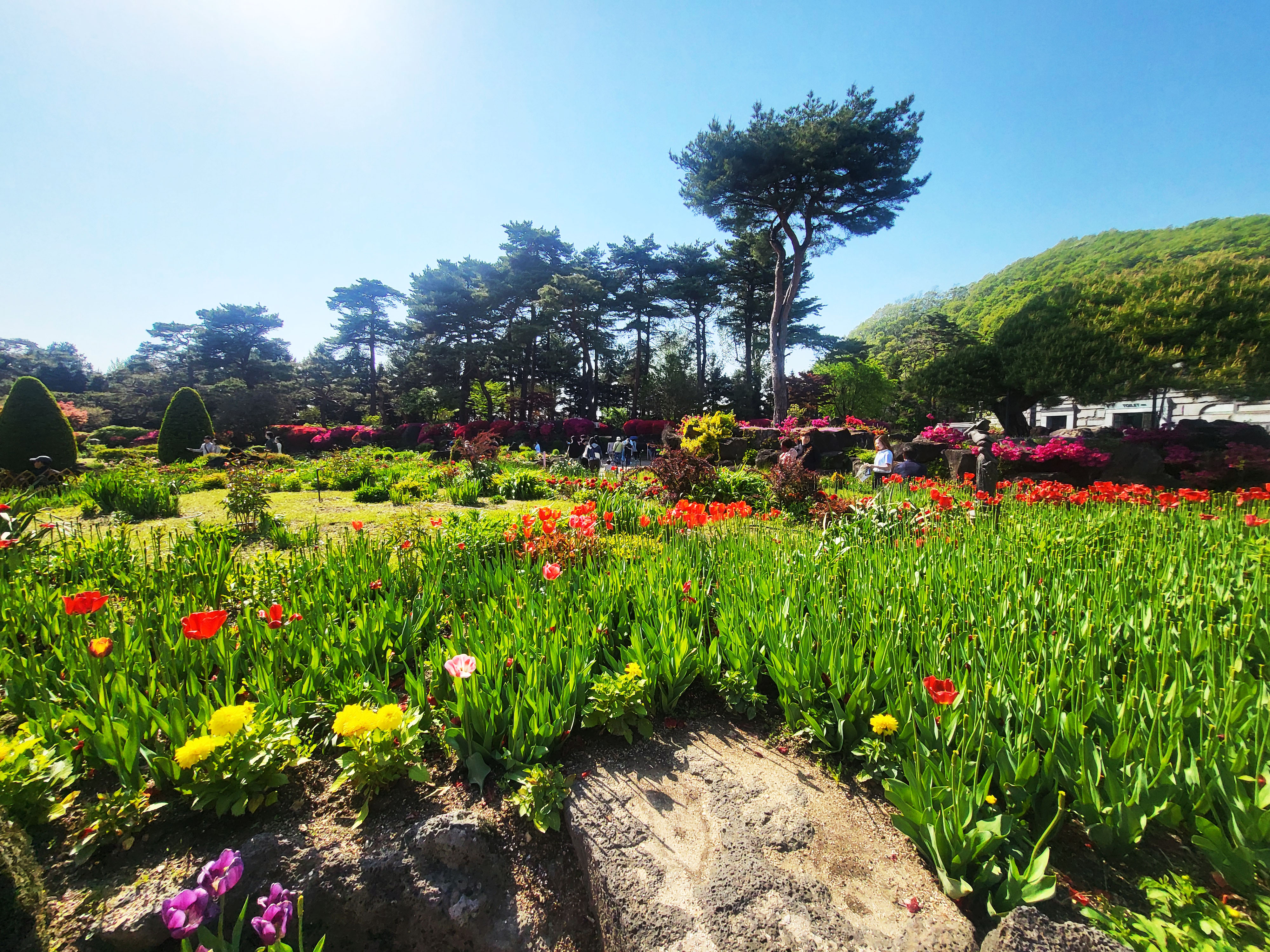 주변에는 꽃들을 감상하며 사진을 찍는 가족,