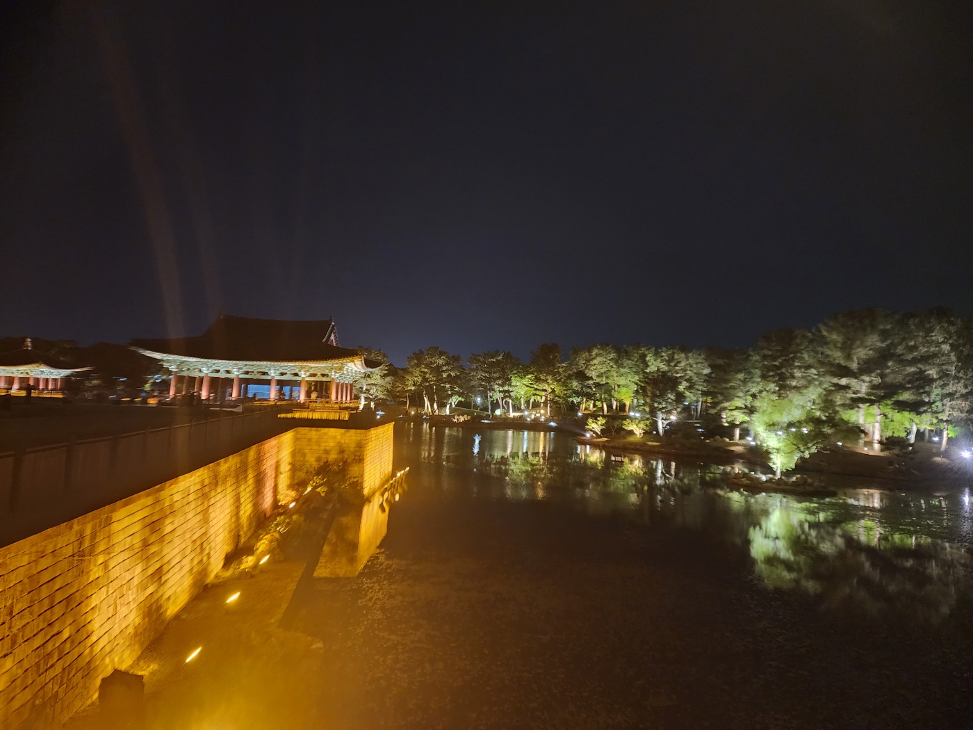 노란 조명이 임해전지 건물과 돌담,