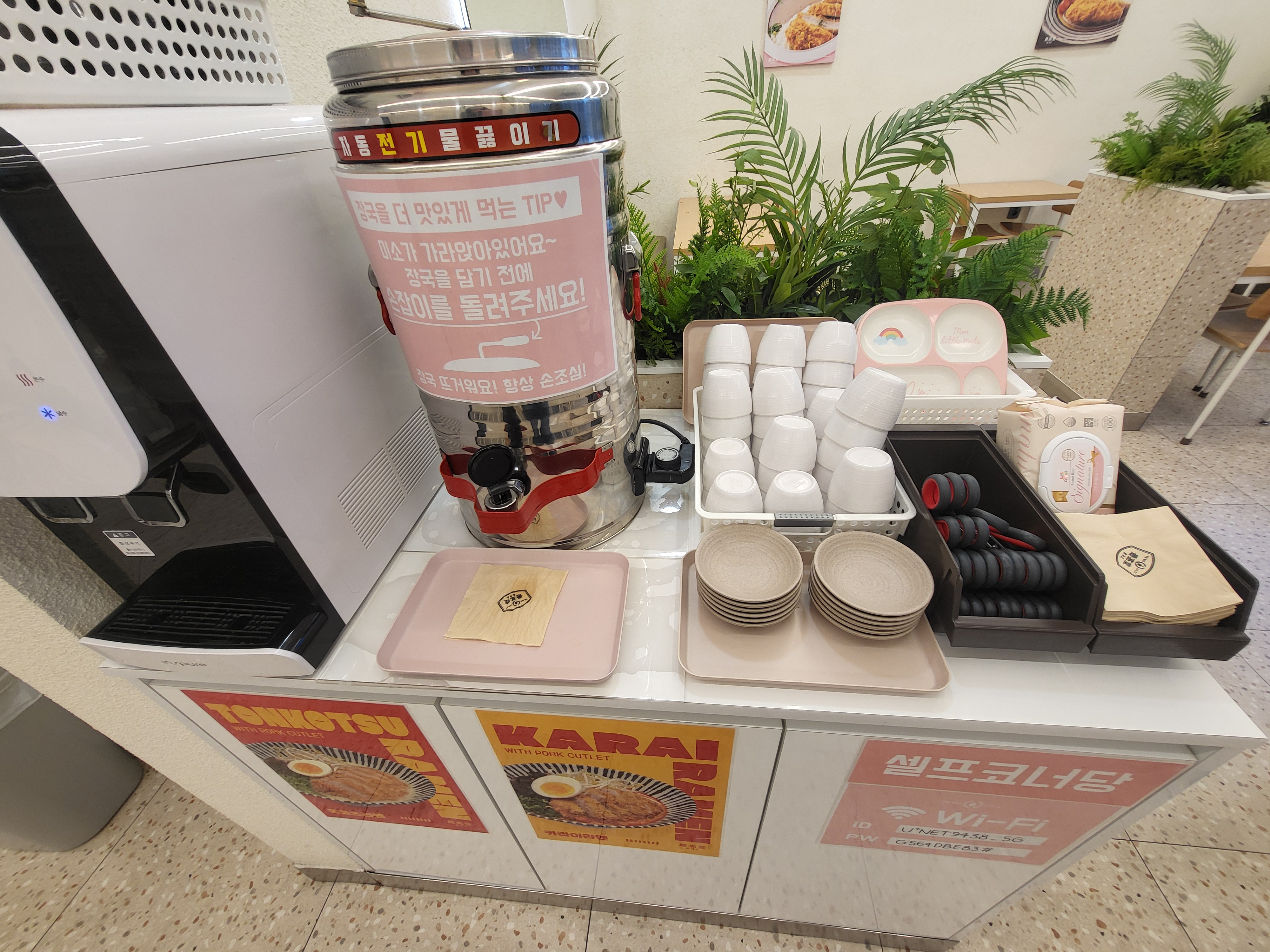 셀프 코너에는 장국, 물, 컵, 젓가락 등