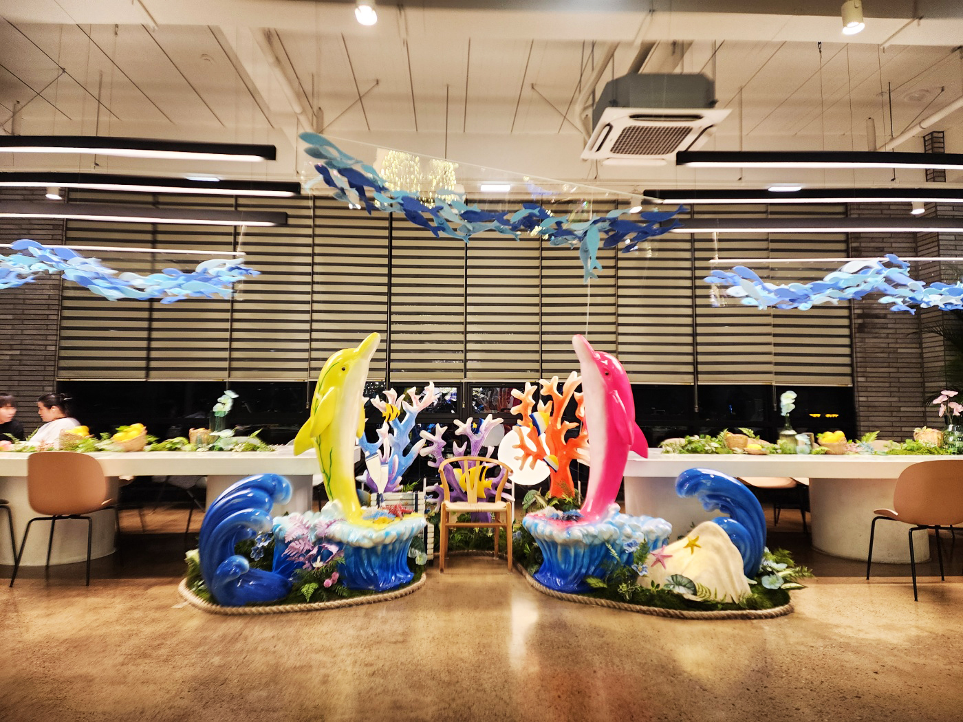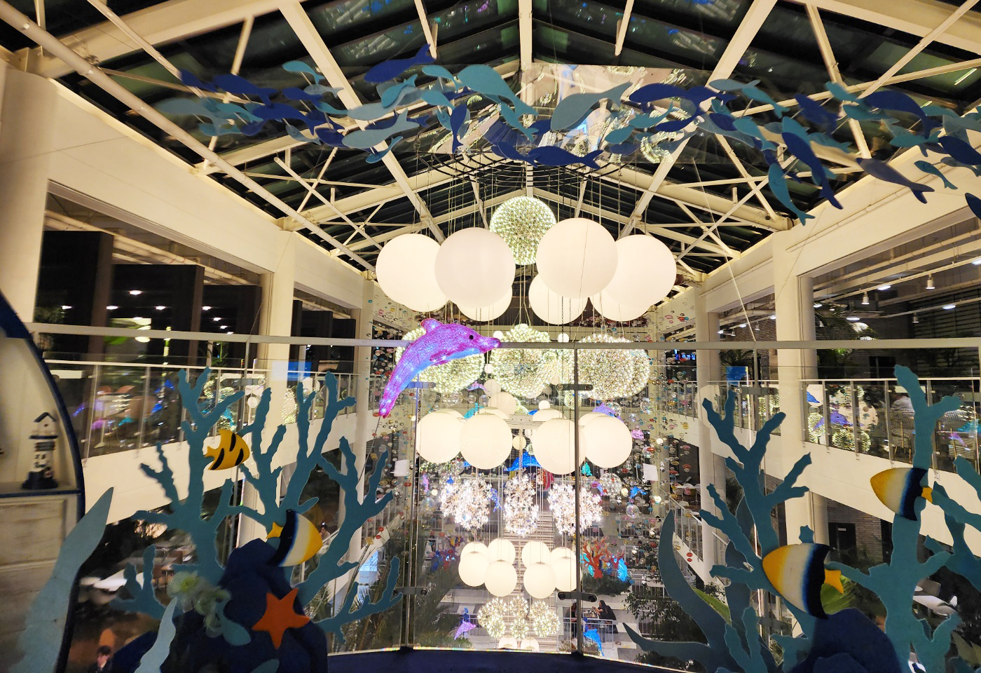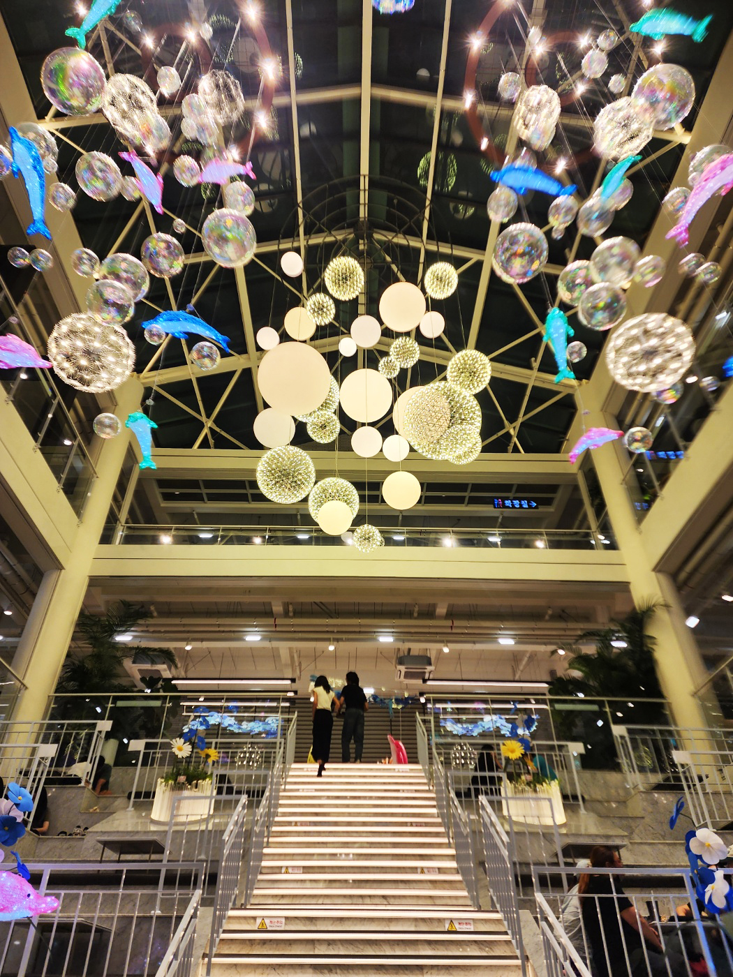 천장에 매달린 구형 조명과 LED로 반짝이는 돌고래 장식들 🐬,