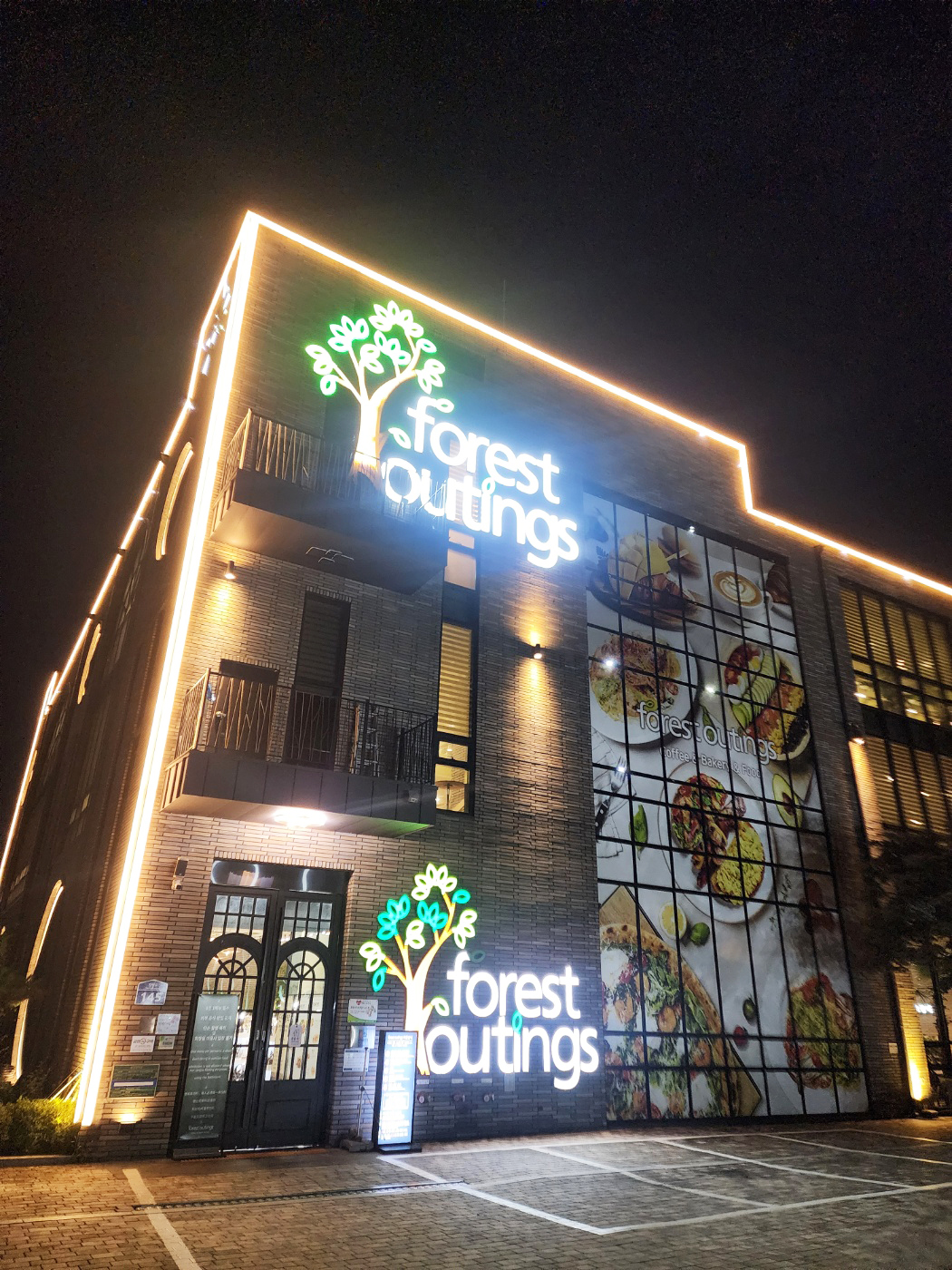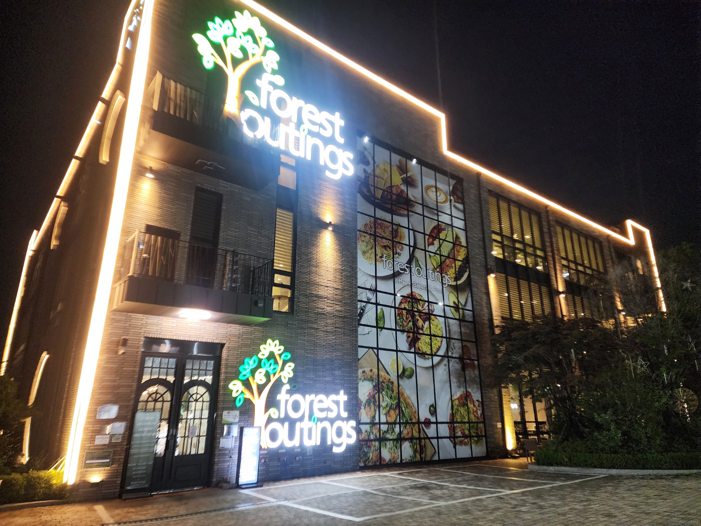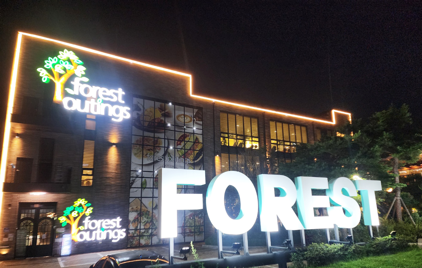 네온 사인으로 빛나는 forest outings 간판과 건물 한쪽을 가득 채운
