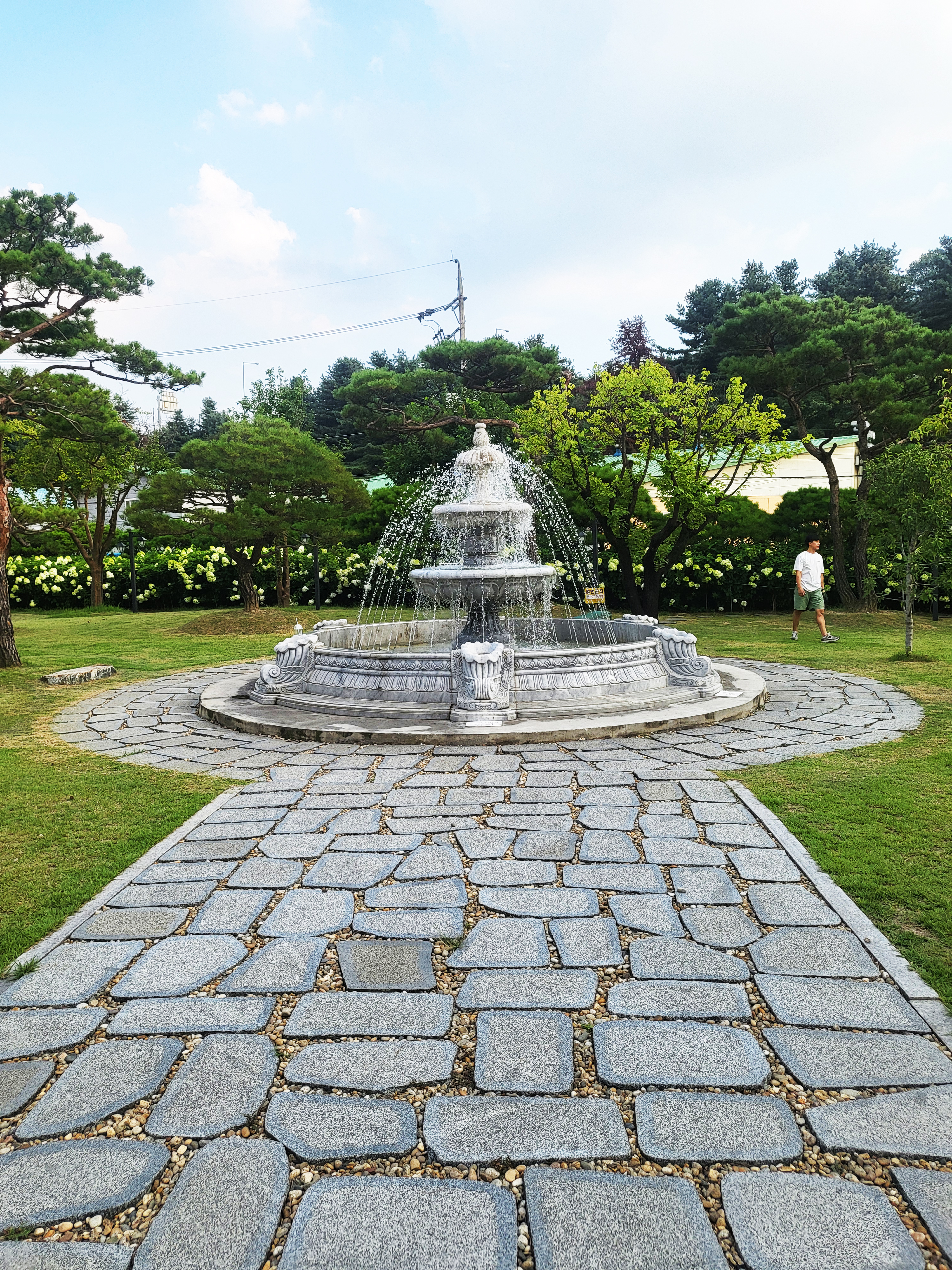 정원에는 멋진 분수대와 넓은 잔디밭,