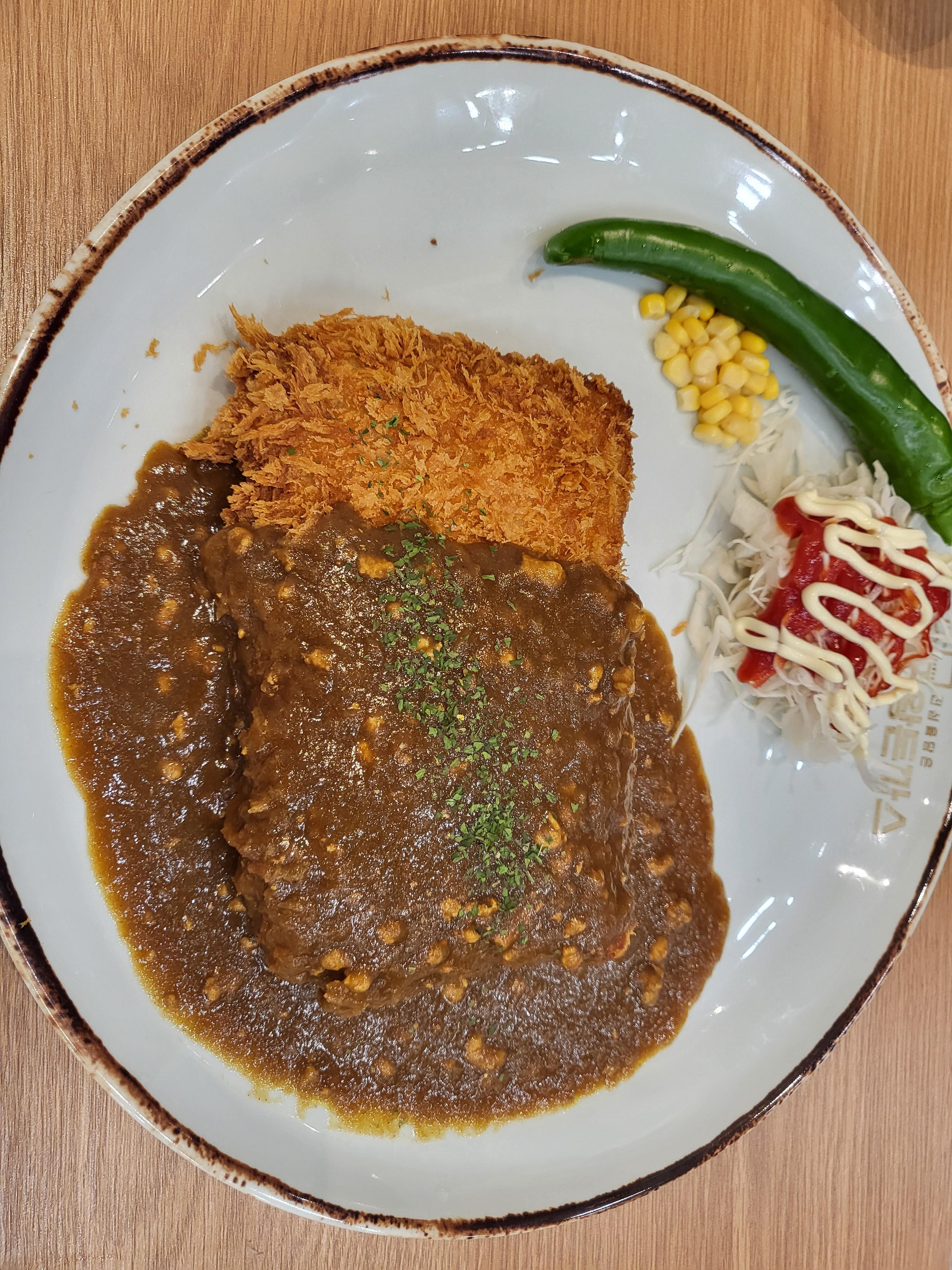 돈까스 위에 얹어진 카레는 걸쭉하면서도