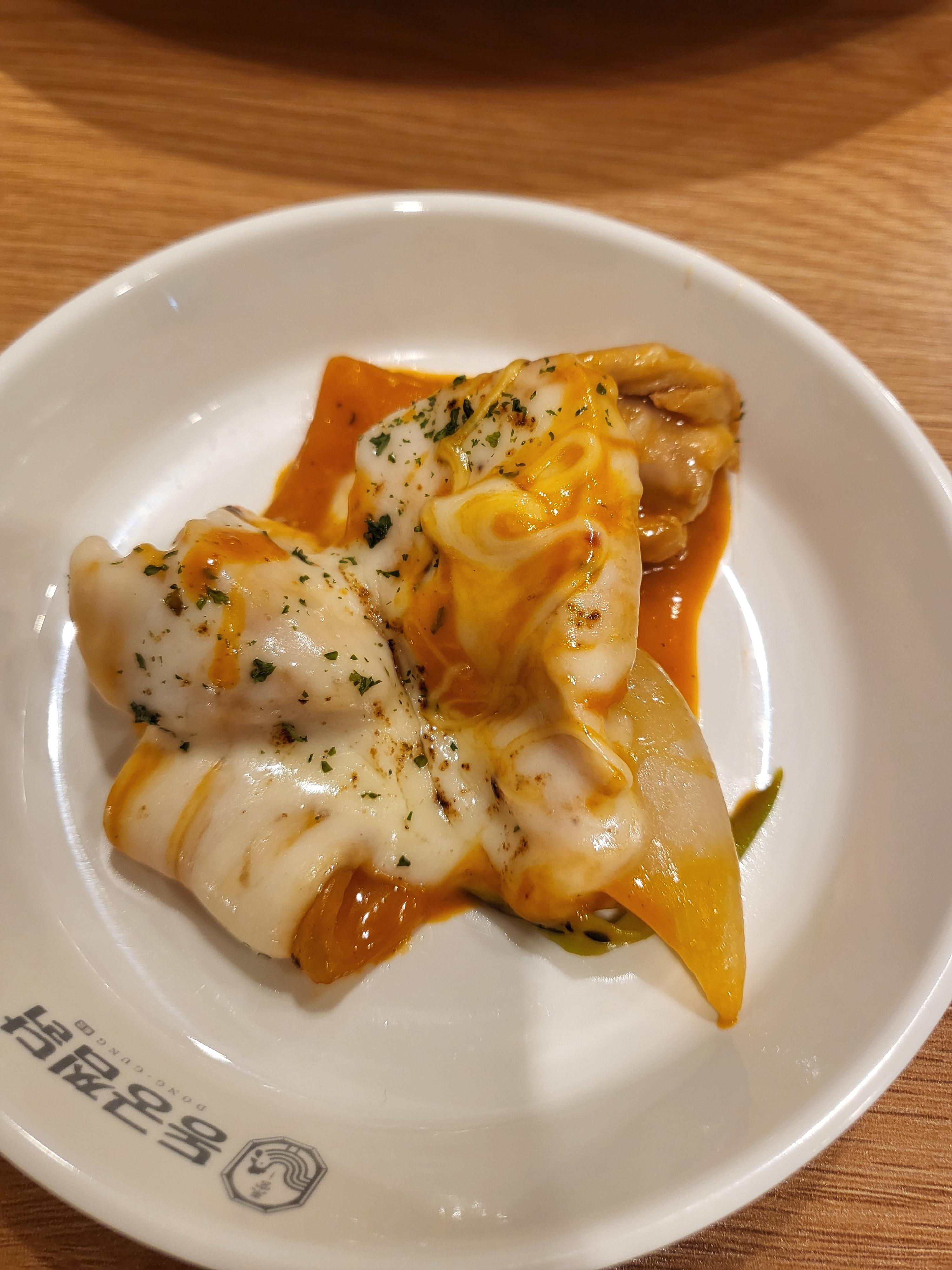 특히 큼직한 닭고기와 떡, 채소를 치즈에