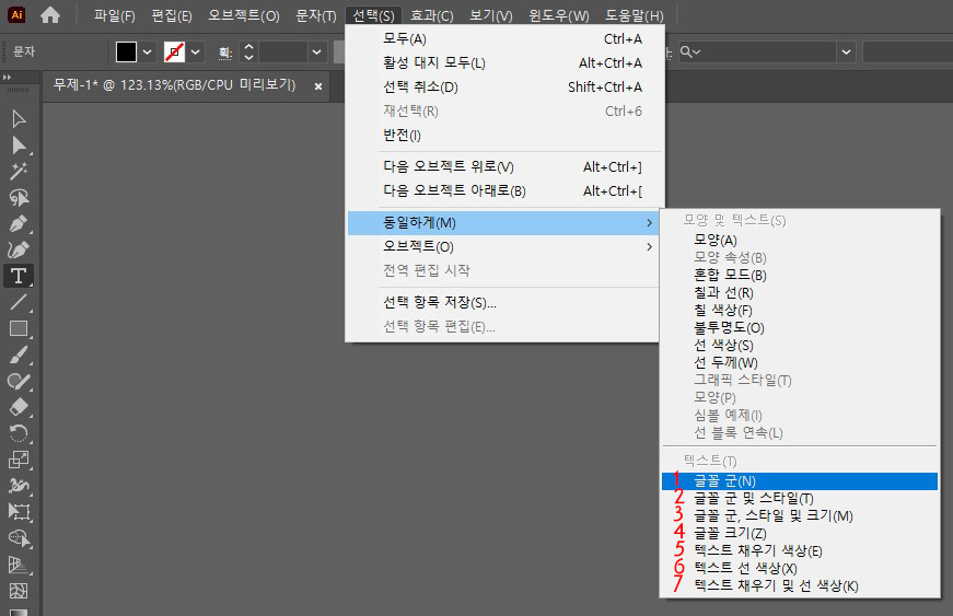 1. 글꼴 군 | 같은 글꼴의 텍스트가 모두 선택됩니다.