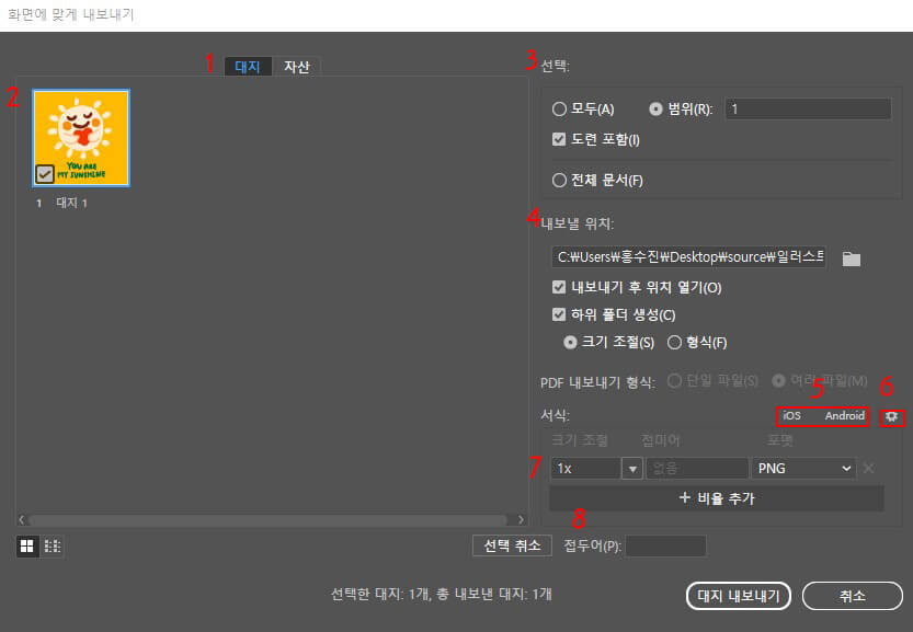 1. 대지/자산 | 저장할 대상이 아트보드 전체인지,