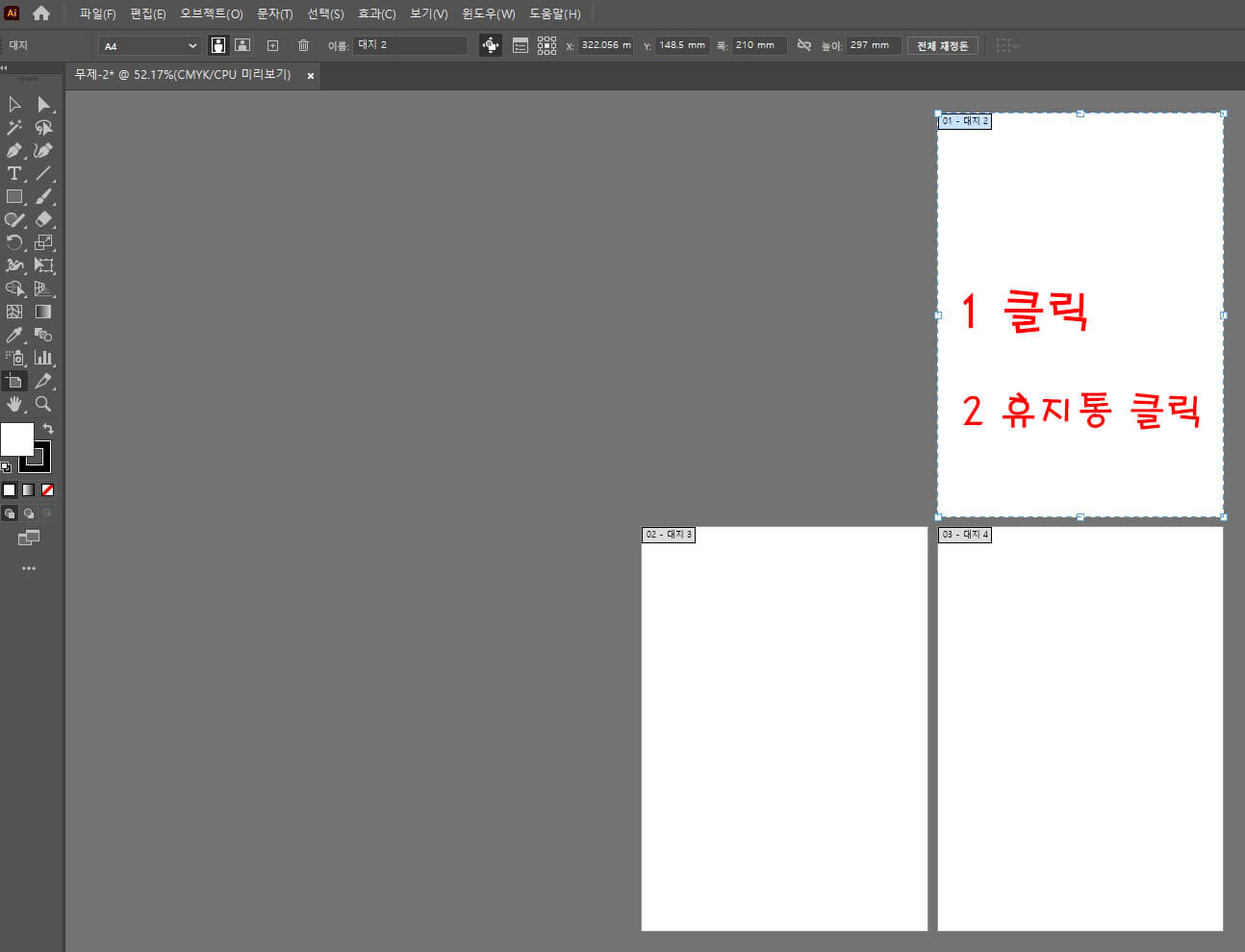 선택을 해제 합니다. 2. 첫 번째 아트보드를