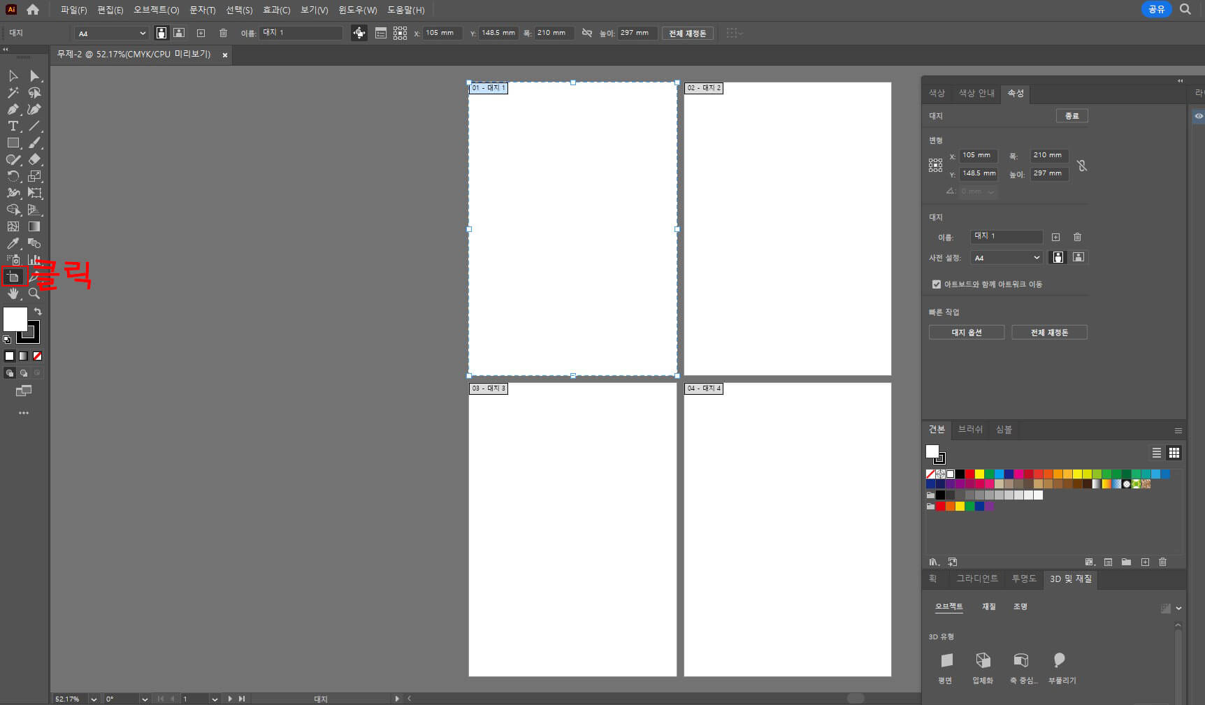 보겠습니다. 1. 오른쪽 아래에 있는 아트보드를