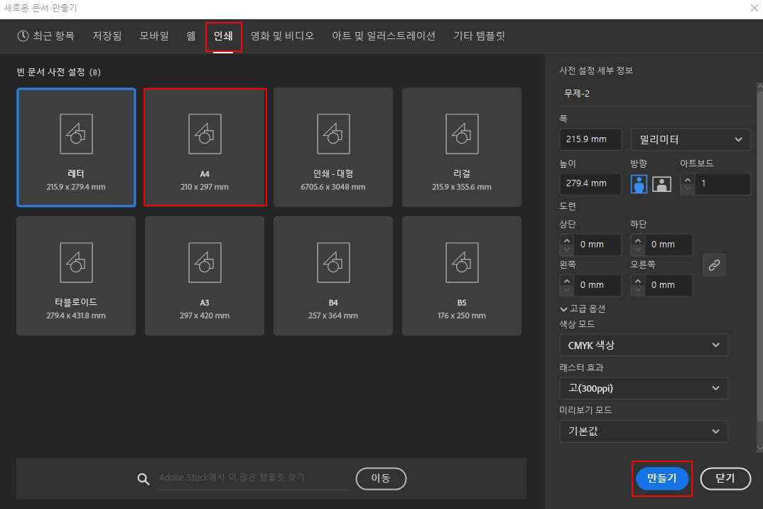 [새로운 문서 만들기]창에서