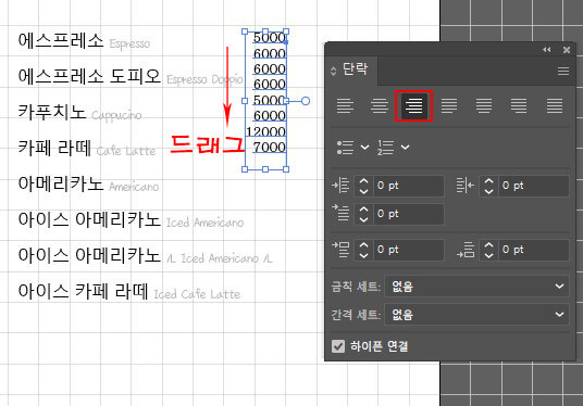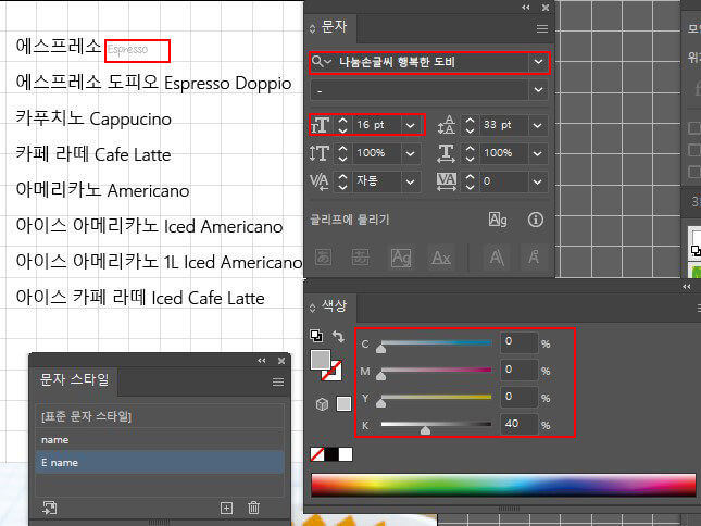 카페 메뉴를 입력하고 글자 스타일을 만들어