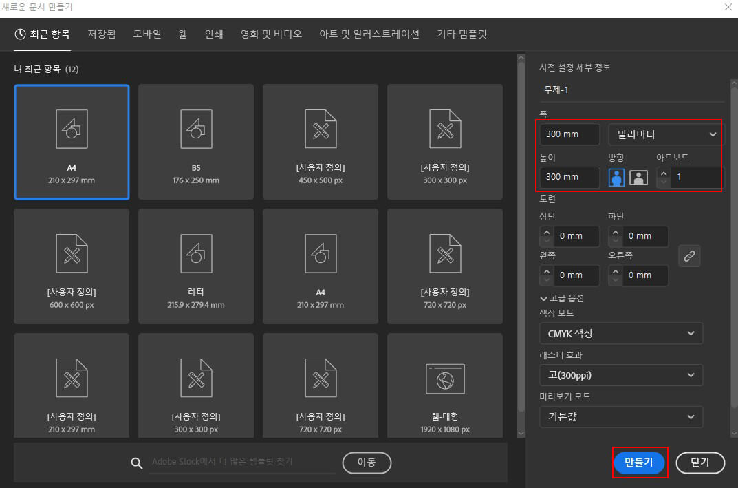 01 Ctrl+N을 눌러 300x300mm크기의