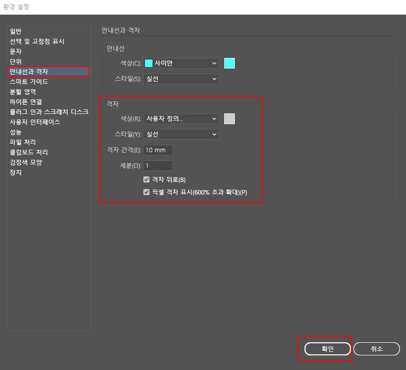 [편집]-[환경설정]-[안내선과 격자] 메뉴를