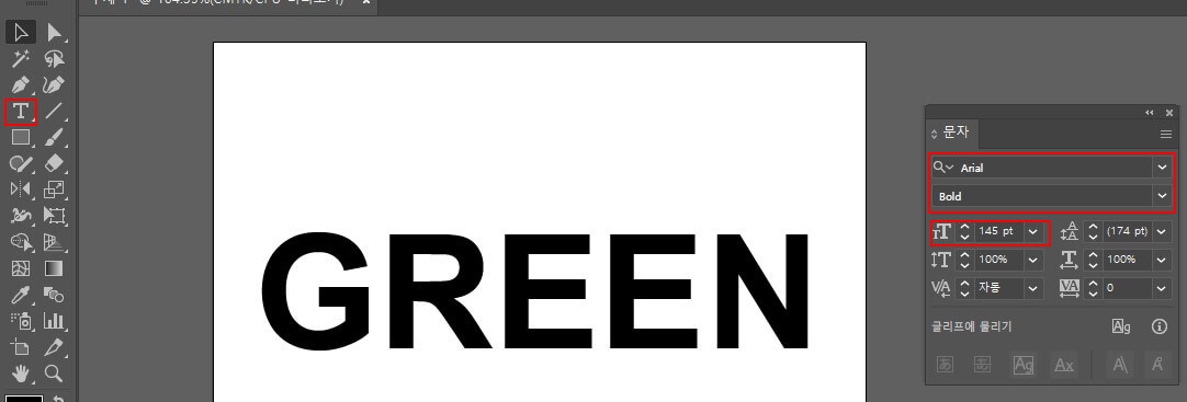 입력합니다. 문자 패널에서 폰트는 Arial,